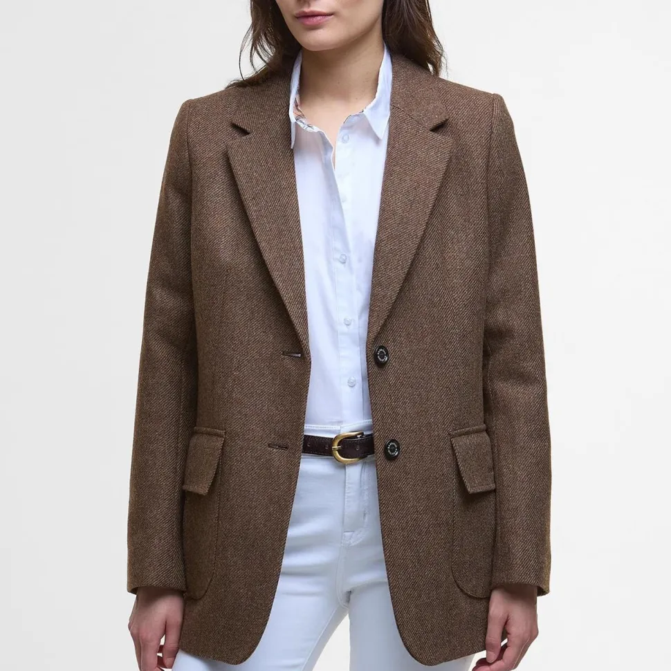 Sofistikeret blazer, der kombinerer klassisk skrædderi med vinterklar komfort . Blazeren er fremstillet i 100% uld, hvilket giver naturlig varme og en luksuriøs fornemmelse på kølige dage. Det enkeltknappede design er skræddersyet i en lige pasform, som fremhæver silhuetten uden at gå på kompromis med komforten. Indvendigt fuldendes looket med Barbours karakteristiske jacquard-for, der tilføjer et eksklusivt finish og understreger brandets arv inden for kvalitet og håndværk. Uanset om blazeren styles til begivenheder eller som et sofistikeret alternativ til overtøj, er den et stilfuldt investeringselement, der holder sæson efter sæson.