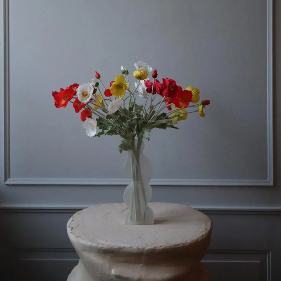 Naturtro valmueblomst i den fineste farvenuance. Blomsten harmonerer smukt, når den kombineres til en enkelt buket, idet der herved skabes et iøjnefaldende fokuspunkt, der efterlader et varigt indtryk. Blomsterhovedet er lavet af et stofmateriale, mens bladene er dækket med trichomer, for at genskabe udseendet af en naturlig valmue. Blomsten er designet til at være alsidig, hvorfor stilken kan bøjes og formes efter eget ønske. Lad kreativiteten blomstre!