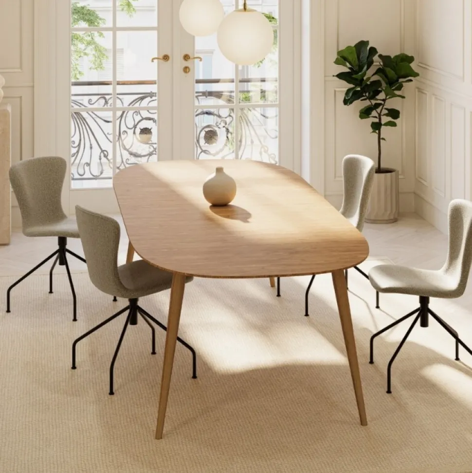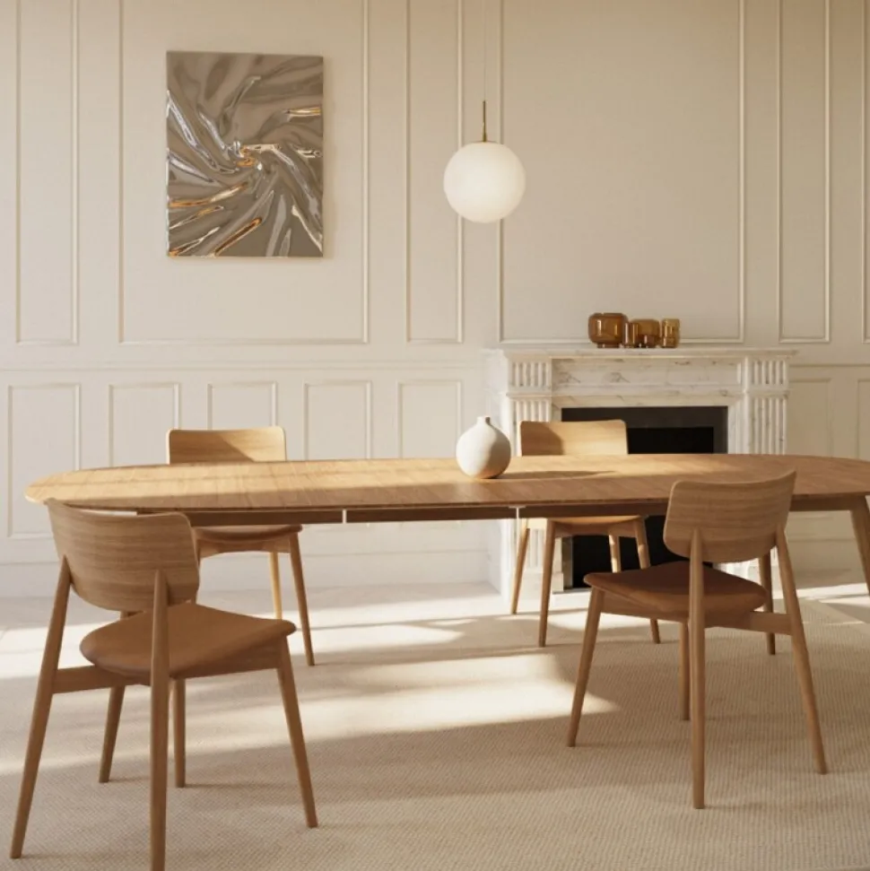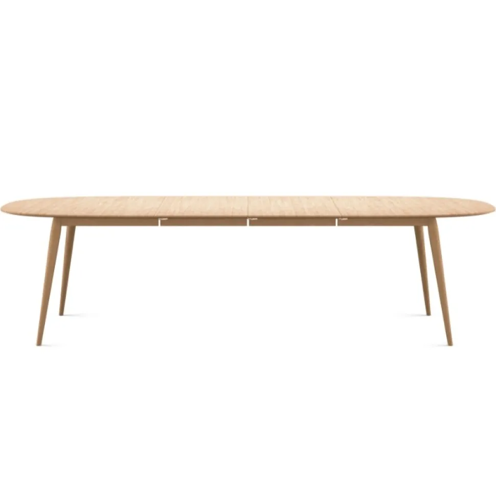 Enkelt og stilfuldt spisebord, hvis bløde kurver, robuste materialer og danske håndværk sikrer et tidløst design, som kun bliver smukkere med tiden. Bordet kan rumme alt fra en simpel familiemiddag til store middagsfester, idet der medfølger to tillægsplader i massivt egetræ, som elegant og kan opbevares inde i bordet.