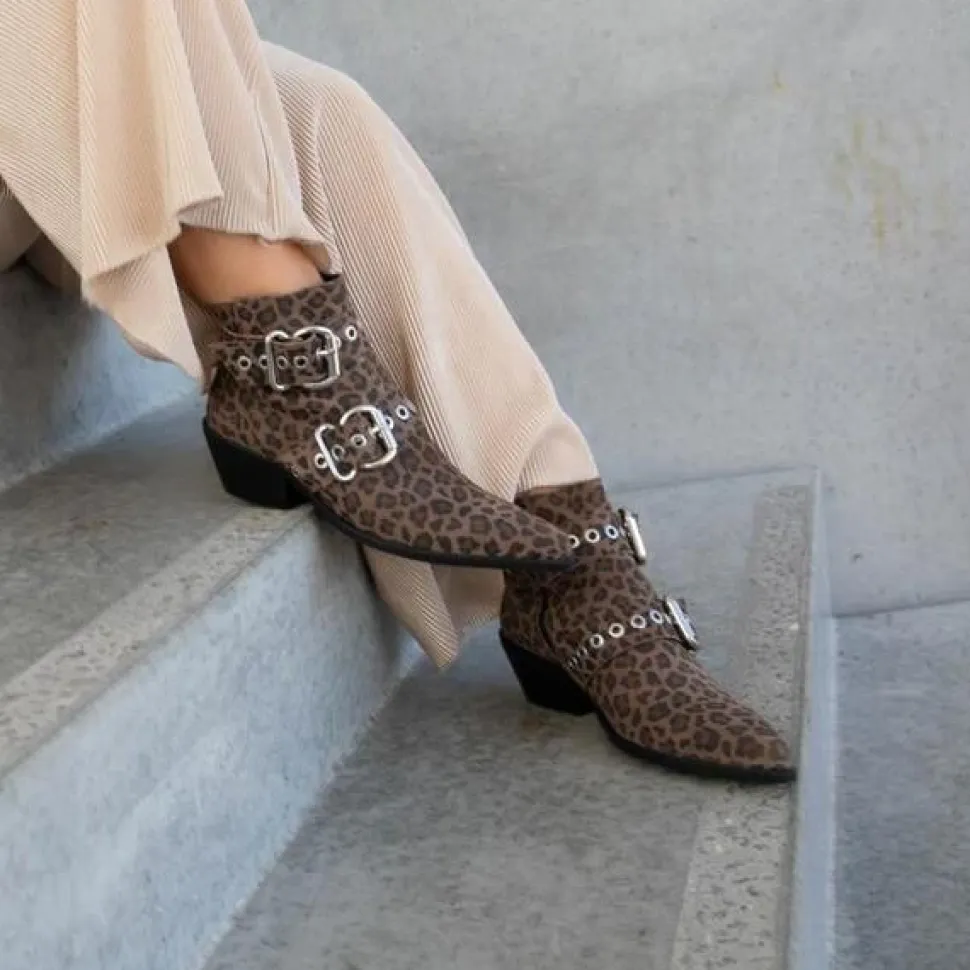 Fine ankelstøvler, der lader ethvert skridt udstråle stil og selvtillid. Fremstillet i eksklusivt ruskind med et sofistikeret print, forener støvlerne elegance og kant i ét design. Den spidse tå og den lille hæl giver et feminint og raffineret udtryk, mens de to sølvspænder tilføjer et råt touch. Den praktiske lynlås på indersiden sikrer ideel pasform, mens indersålen sikrer optimal komfort, der varer hele dagen.