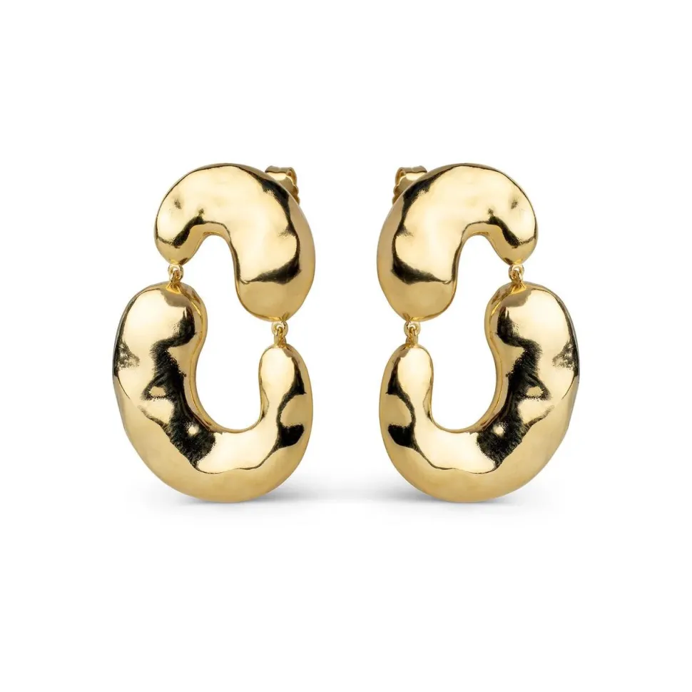 Skulpturelle øreringe, der forener styrke og elegance i et organisk formsprog. De to store, bløde elementer er forbundet i en svungen bevægelse, der minder om flydende metal – levende, sanseligt og fuld af karakter. Den blanke overflade reflekterer lyset smukt og giver dybde til designet, mens den lette konstruktion gør øreringene behagelige at bære, trods sit markante udtryk. Et smykke med volumen, personlighed og moderne sensibilitet – skabt til den, der tør bære noget ekstraordinært med ro og raffinement.