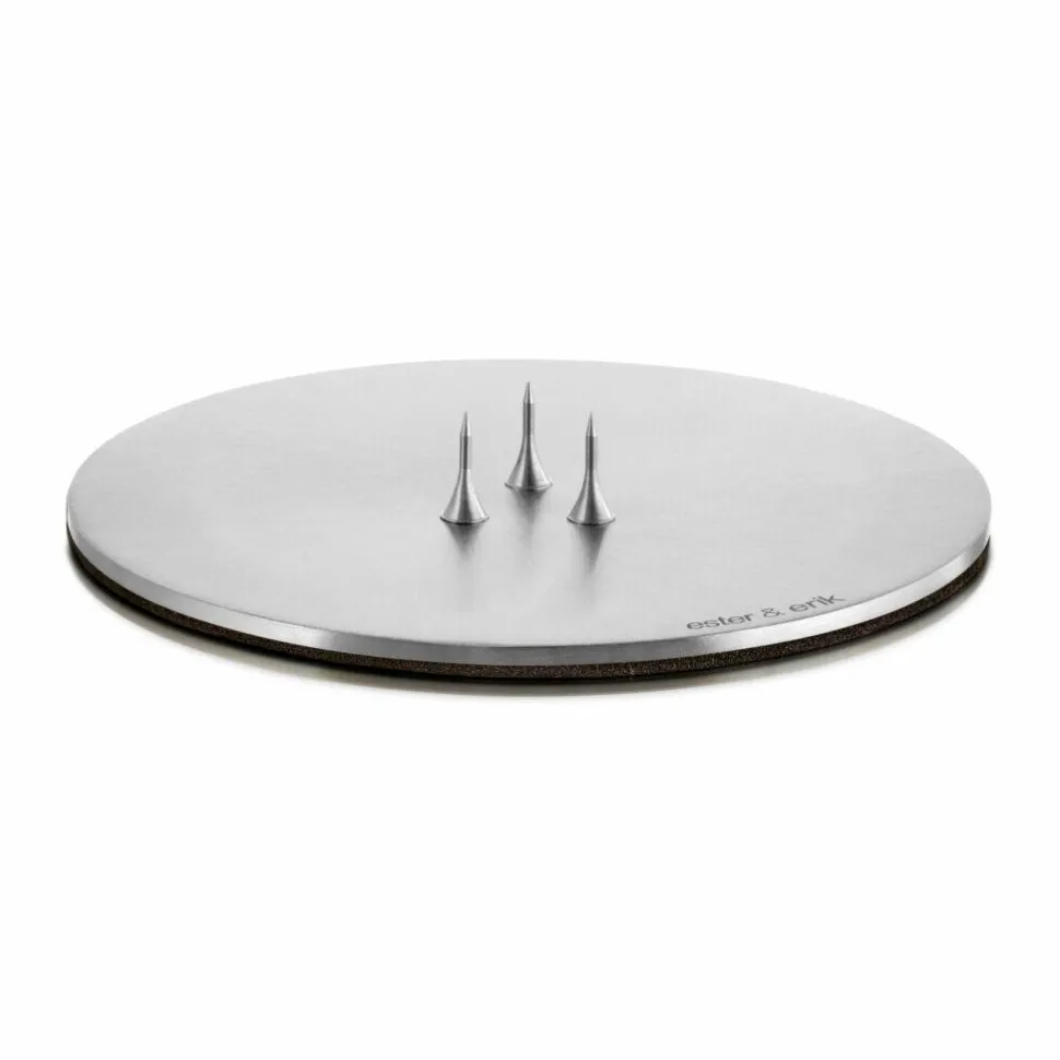 Minimalistisk og rund platte i det fineste, tidløse design. Platten er ideel til de håndlavede lys fra Ester & Erik – i særdeleshed til kegle- og bloklys. Lyset fastholdes på platten af tre stifte i bunden, hvorved alle lys kan stå stabilt. Desuden er der tilført skum på bagsiden af platten for herved at skåne underlaget. Som overfladebehandling er der anvendt PVD, hvilket er en ny miljøvenlig måde at coate metaller på, som samtidig giver en suveræn kvalitet og finish.