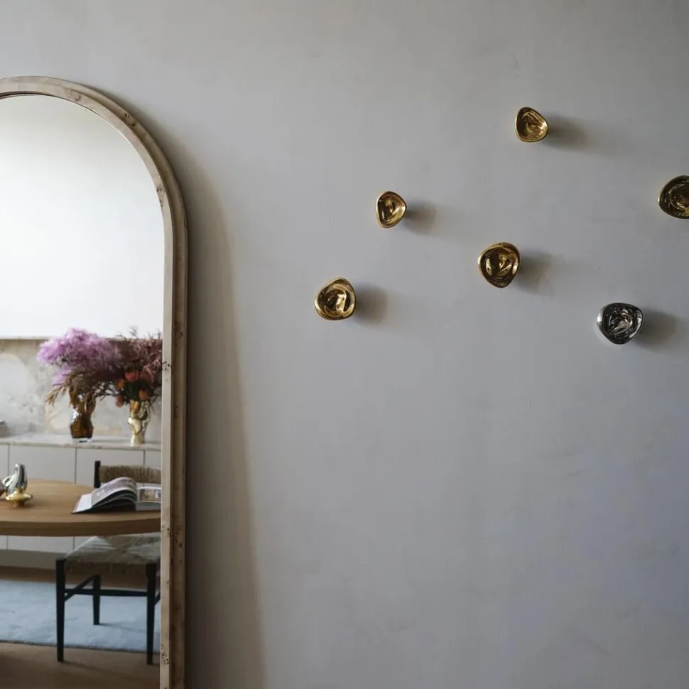 Enkel og moderne knage, der på fineste vis dekorerer hjemmets vægge. Knagen er inspireret af vandoverfladens bølgende bevægelser, hvilket afspejles i den organiske og ujævne overflade. Kontrasten mellem det hårde materiale og bløde formsprog tilføjer et unikt touch, der både er dekorativt og funktionelt. Knagen er håndlavet ved sandstøbning, hvorfor der kan forekomme variationer i overfladen – herunder små sorte pletter og sandkorn.