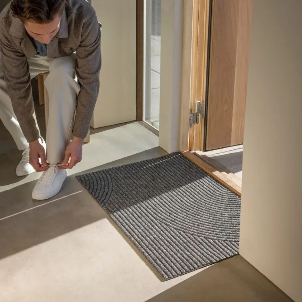 Moderne, minimalistisk og tidløs måtte i et stilrent design. Farvenuancen er alsidig og motivet er udført med bløde, behagelige bevægelser, der er inspireret af nature og japanske Zen-haver. Det tredimensionelle mønster er taktilt og meditativt, hvorfor der skabes en rolig atmosfære ved dørtrinnet. Måtten er designet med en ru overflade og en gummieret bagside, hvorfor den er velegnet til både inden- og udendørs brug.