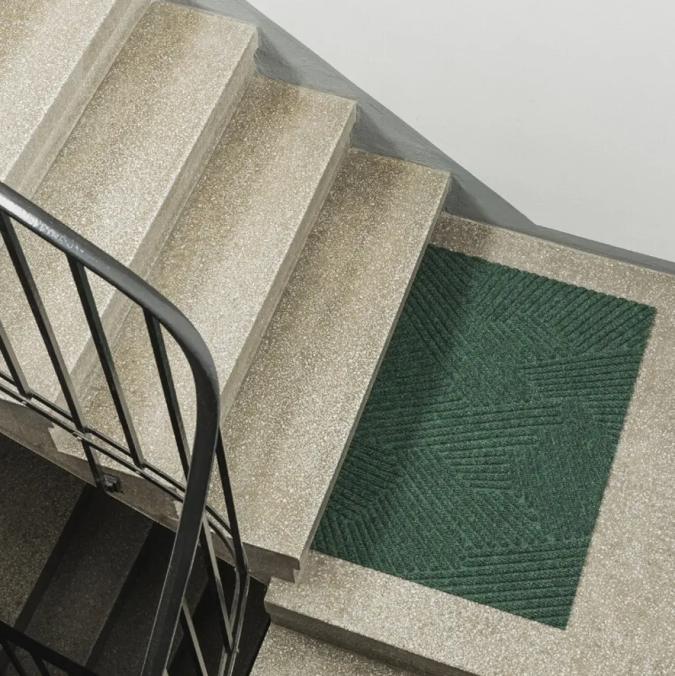 Funktionel og farvefin måtte, der er udført i et minimalistisk design. Måtten er inspireret af græs, der svajer i en varm sommerbrise, hvilket på fineste vis illustreres af et blødt, geometrisk design i en dyb grøn farvenuance. Det tredimensionelle mønster er taktilt og meditativt, hvorfor der skabes en rolig atmosfære ved dørtrinnet. Måtten er designet med en ru overflade og en gummieret bagside, hvorfor den er velegnet til både inden- og udendørs brug.