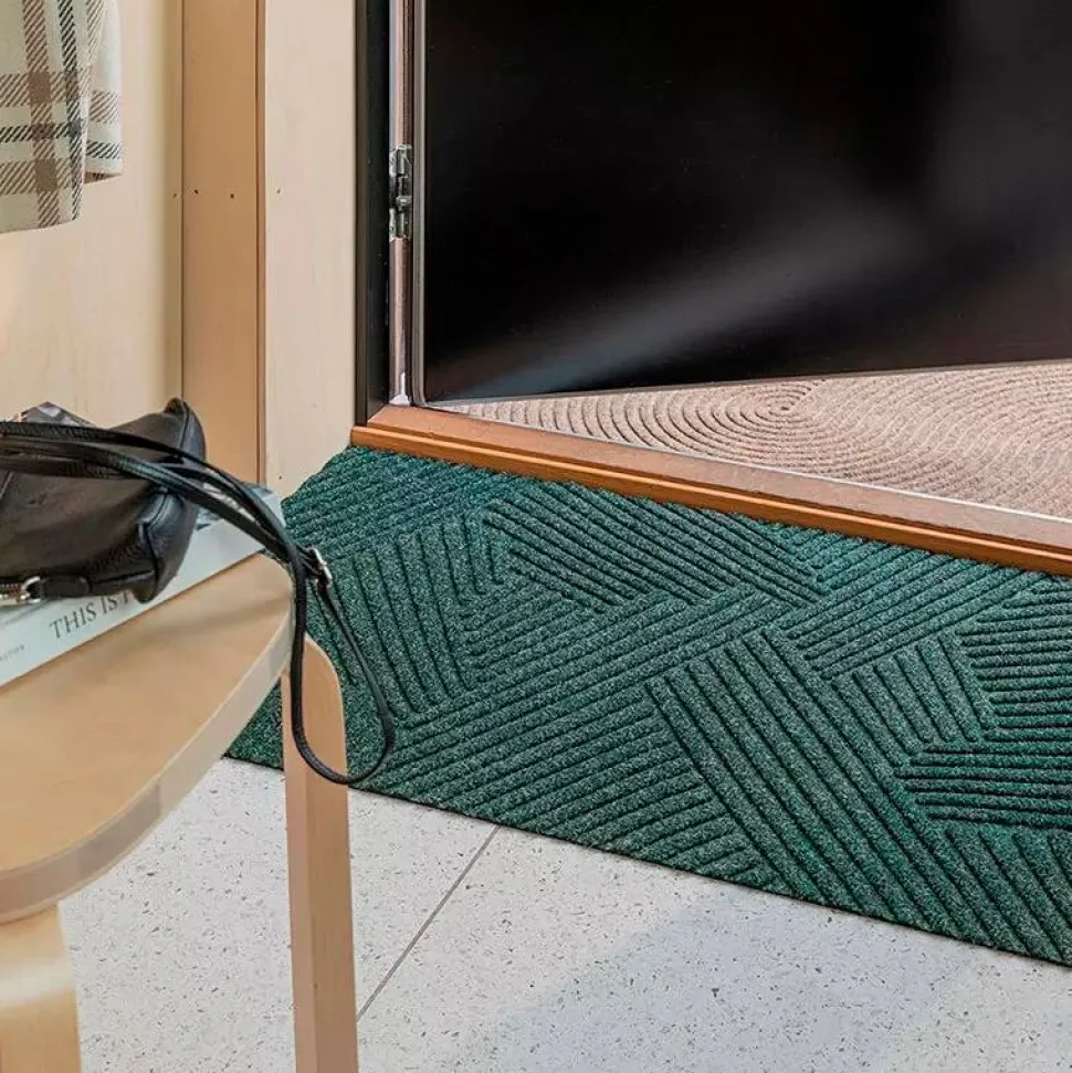 Funktionel og farvefin måtte, der er udført i et minimalistisk design. Måtten er inspireret af græs, der svajer i en varm sommerbrise, hvilket på fineste vis illustreres af et blødt, geometrisk design i en dyb grøn farvenuance. Det tredimensionelle mønster er taktilt og meditativt, hvorfor der skabes en rolig atmosfære ved dørtrinnet. Måtten er designet med en ru overflade og en gummieret bagside, hvorfor den er velegnet til både inden- og udendørs brug.