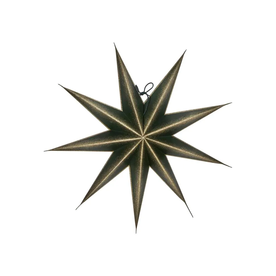 Oplev julens magi med denne fine, håndlavede stjerne i mørkegrønt papir. Den ni-takkede form og det fine champagneglimmer skaber et elegant og festligt udtryk, der fanger lyset og spreder en varm stemning i rummet. Stjernen kan hænges alene som et stilrent statement eller kombineres i klynger for et mere iøjnefaldende udtryk. Monteres den med en lyskilde, oplyses den af en blød, betagende glød, der forstærker julens magiske atmosfære. Et eksklusivt og tidløst element, der bringer elegance og juleglæde ind i hjemmet.
