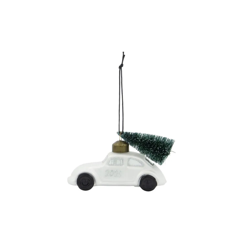Oplev julens nostalgi med denne håndlavede, mundblæste julebil i glas. Den charmerende hvide bil er dekoreret med sølvglimmer og bærer et lille juletræ på taget – et symbol på den hyggelige tradition med at hente juletræet hjem til jul. Ornamentet er detaljeret med årstallet 2025 og bringer både varme og personlighed til din juleudsmykning. Et unikt ornament, der indfanger julens magi og spreder glæde år efter år.
