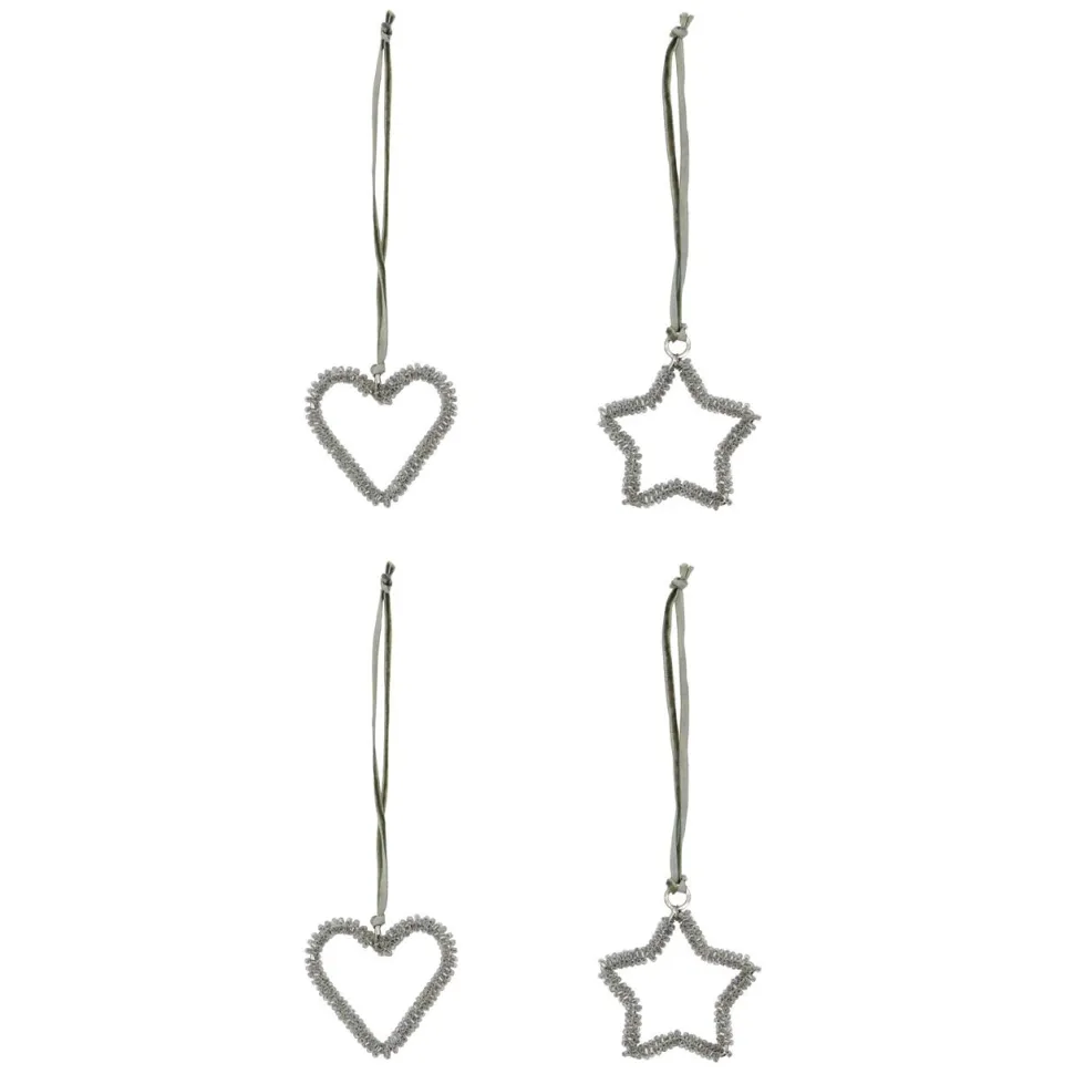 Udsøgte juleornamenter i stjerne- og hjerteformer, der tilfører juledekorationen et strejf af elegance og festlig glans. Fremstillet af jern og prydet med glitrende sølvperler, reflekterer de lyset smukt og skaber en magisk julestemning i hjemmet. Sættet består af fire unikke ornamenter, som let kan hænges med bløde velourbånd. De er ideelle på juletræet, i grene eller som del af et stilfuldt bordarrangement. Kombinationen af robust materiale og delikate detaljer giver et tidløst og raffineret udtryk. Et dekorativt sæt, der bringer varme, glans og festlig elegance til julens indretning.