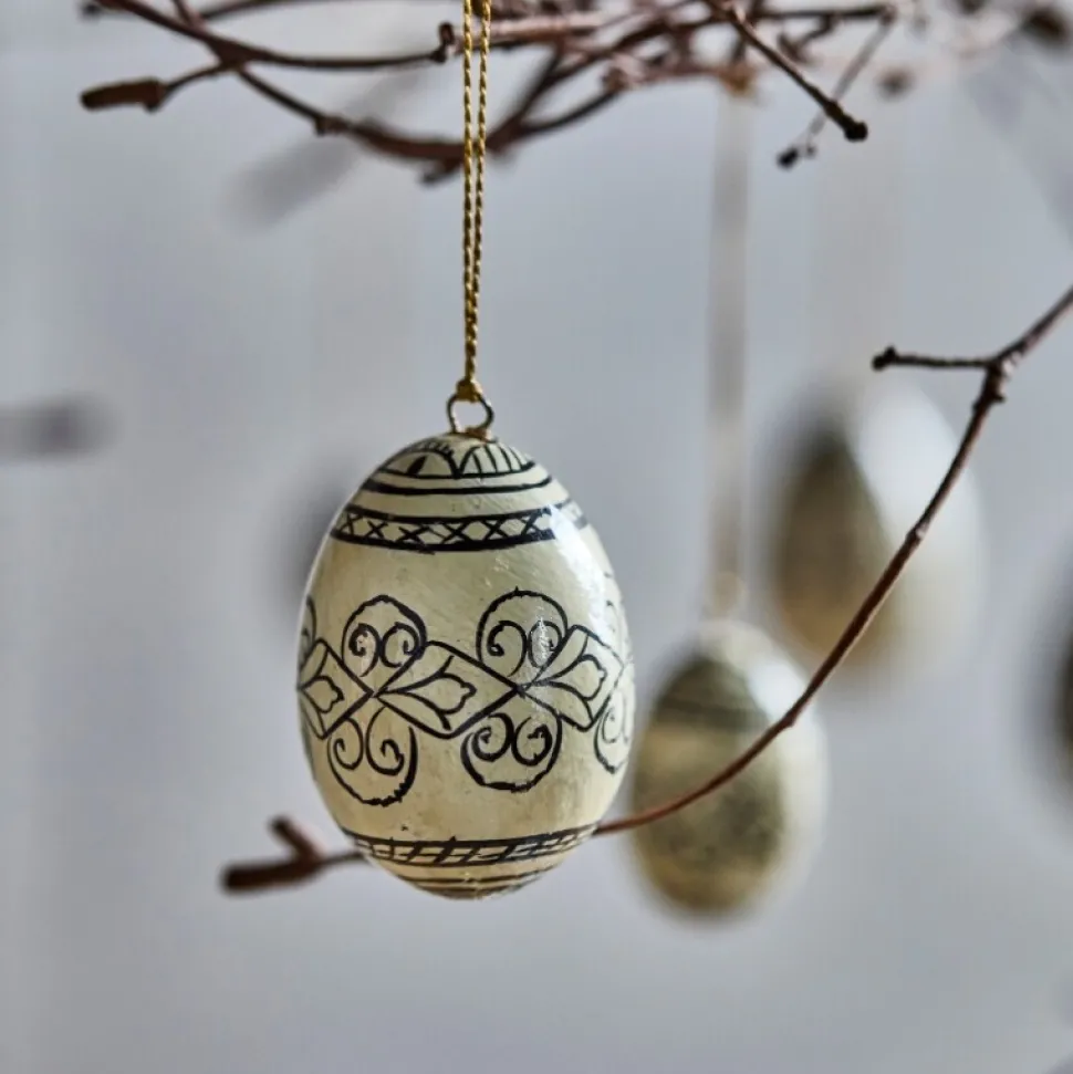 Elegante påskeæg, håndmalet med smukke mønstre. Påskeæggene vil helt sikkert tilføre lidt ekstra hygge og elegance til dit hjem i påsken. De er perfekte til at hænge på en gren i en vase, placere dem i en skål som en dekorativ detalje på bordet eller bare sprede dem rundt i hjemmet for at skabe en hyggelig påskestemning.
