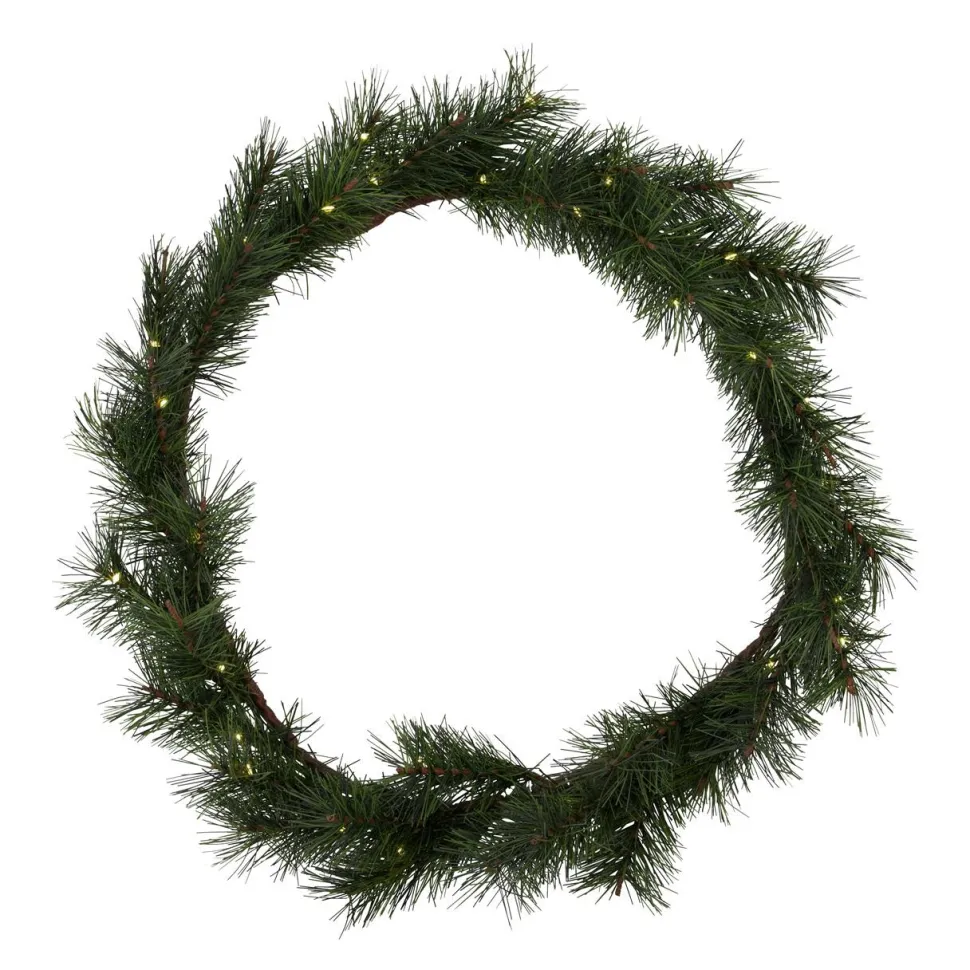 Skab en varm og indbydende julestemning. Kransen er et elegant og holdbart alternativ til den klassiske fyrrekrans. Det naturtro design er udstyret med 25 integrerede LED-lys, der spreder et blødt og hyggeligt skær i vintermørket. Kransen er ideel til at hænge i entréen som en festlig velkomst eller placere i stuen som en del af en personlig juledekoration. Den kan anvendes, som den er, eller dekoreres med bånd, kugler og grene for et individuelt udtryk. Med batteridrift og indbygget timerfunktion tændes lyset automatisk i seks timer ad gangen, så kransen nemt skaber stemning dag efter dag. Et stilfuldt og genanvendeligt valg, der forener funktion, æstetik og julens magi.