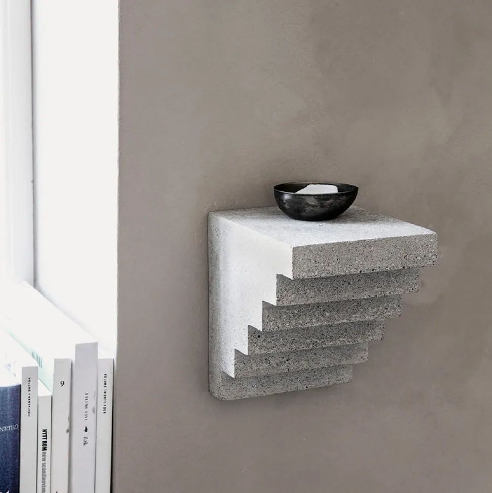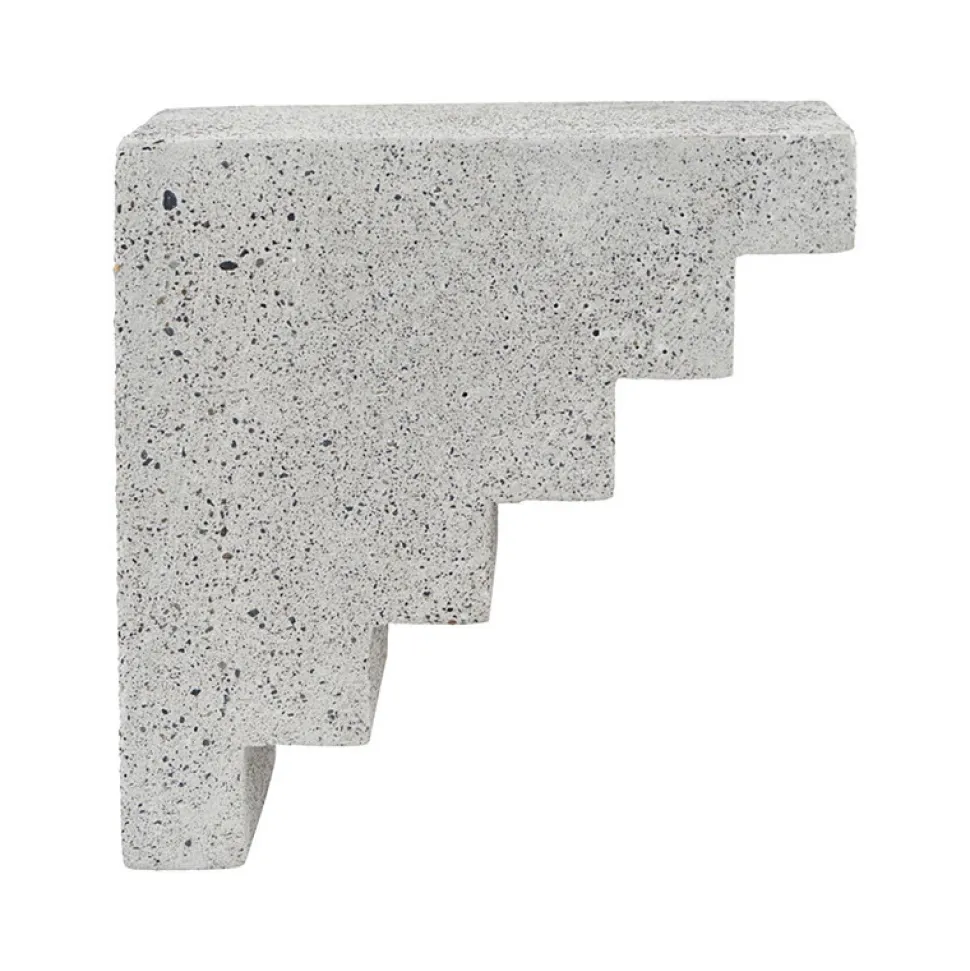 Sjovt og finurligt kunststykke, som foruden dit fine design har et utal af anvendelsesmuligheder. Man kan eksempelvis anvende den som bogstøtte i reolen, som en lille hylde eller blot som et dekorativt element i indretningen. Kunststykket har grålige nuancer og er fremstillet i cement, hvorfor den er enkel i designet.
