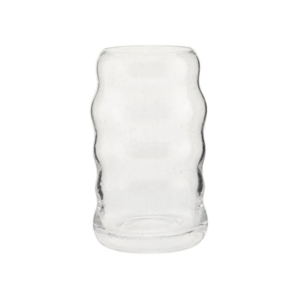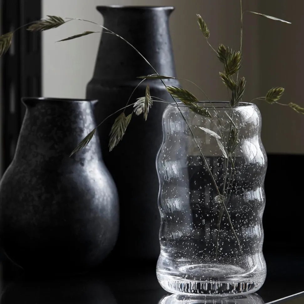 Lille og fin glasvase i et bølget og organisk design. Vasen er designet med de fineste, små luftbobler, der bringer noget ekstra til designet. Glasvasen er ideel i vindueskarmen med en enkelt tørret blomst eller håndblokkede vilde blomster. Herudover kan man med fordel benytte den i et unikt stilleben i kombination med andre materialer, teksturer og overflader.