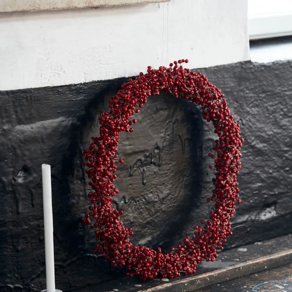 Farvefin krans, der skaber en klassisk julestemning. Kransen består af smukt arrangerede træperler på en solid metalramme, hvor hver rød perle er omhyggeligt snoet på plads for et naturtro og elegant udtryk. Den er ideel som dekoration i entréen, hvor den byder gæsterne velkommen, eller som et stilfuldt element på stuevæggen. For et mere fyldigt look kan perlerne formes og justeres efter ønske, hvilket gør den fleksibel til forskellige dekorative løsninger.