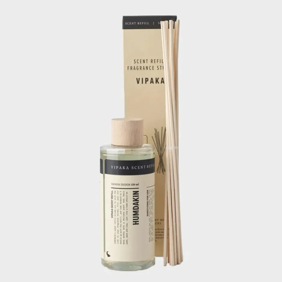 Duftrefill til Vipaka-duftpinde. Med dette produkt forlænges levetiden for de originale Vipaka-duftpinde med glasflaske ved at genopfylde olie og pinde. Duftnoterne er friske, hvorfor der skabes en trøstende og indbydende atmosfære i hjemmet. Duften kombinerer det søde og varme rav med den jordnære moskusduft.