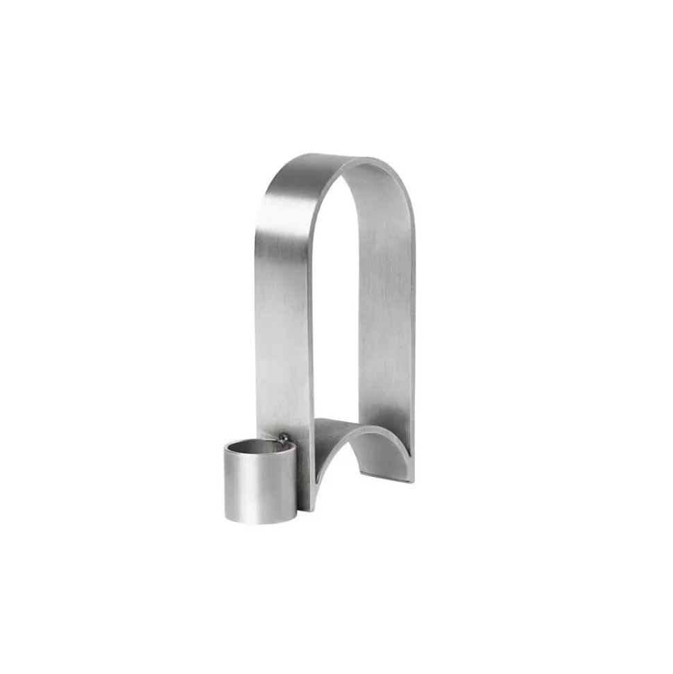 Elegant og skulpturel lysestage, som demonstrerer kunsten i et minimalistisk og enkelt design. Den enkle formgivet lysestage, der fungerer som en ekstravagant udsmykning til hjemmet, er udformet af strålende rustfrit stål. Designets hjørnesten er en bue, deraf navnet kandelabren, der gentages to gange i strukturen. Lysestagen er både skulpturel og funktionel, hvorfor den ikke blot er til blød belysning i den danske vinters mørke måneder.