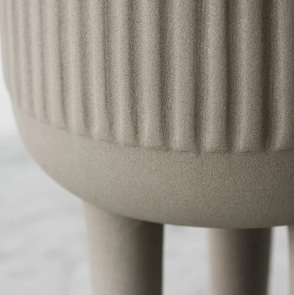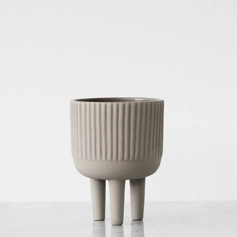 Lille, elegant og trebenet urtepotte, som tilfører et karakteristisk særpræg i enhver boligindretning. Urtepotten er fremstillet af grå mat glaseret terrakotta og glaseret indvendig, således at den er vandtæt. Pottens yderside har øverst et riflet kendetegnende mønster, som er præget ind i leret. Karakteristisk for designet er, at den skulpturelle minimalisme, som tydeliggøres i de rene linjer med et skandinavisk og arkitektonisk udtryk.