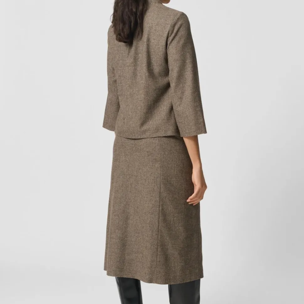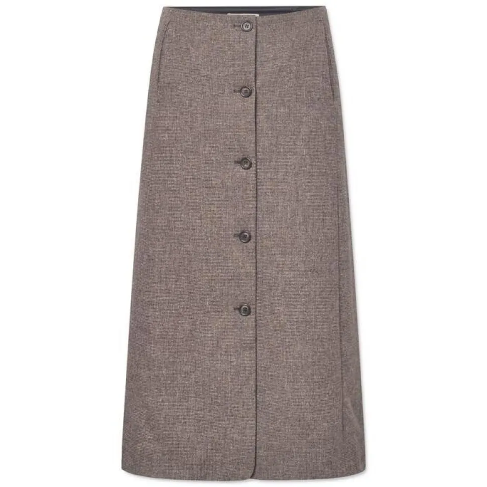 Sofistikeret nederdel med et klassisk mønster og moderne attitude. Det tidløse beige houndstooth-mønster og det ankellange snit giver et elegant udtryk, mens den løstsiddende pasform og de skjulte lommer i kilerne tilfører praktisk komfort og bevægelsesfrihed. Det fine vævede kvalitet, kombineret med en gennemgående knaplukning og let foer, gør nederdelen ideel til både hverdag og mere formelle sammenhænge. Style den med en tætsiddende top eller chunky strik.