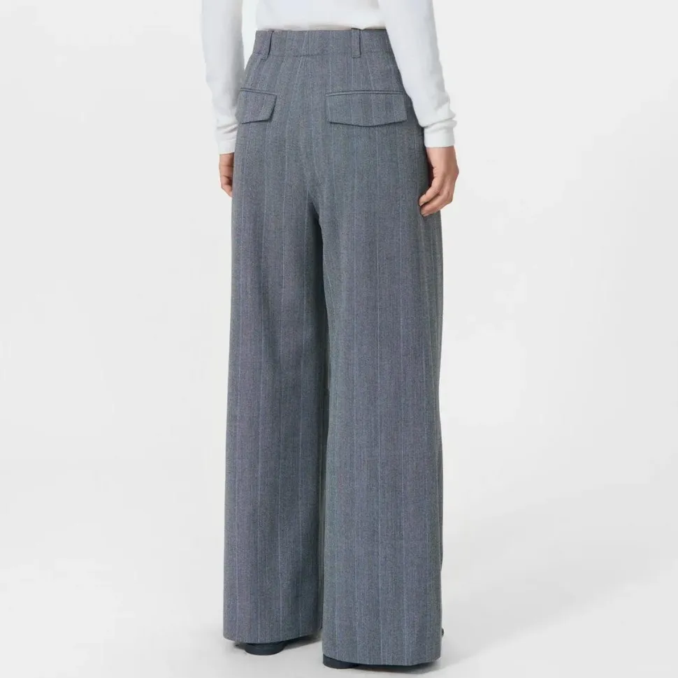 Tidløse bukser med moderne snit og luksuriøs komfort. Bukserne er skabt til den moderne garderobe, hvor stil og funktionalitet går hånd i hånd. De vide ben resulterer i et elegant fald, mens bæltestropperne muliggør tilpasning med et bælte. Praktiske detaljer som sidelommer og baglommer med klap kombinerer funktionalitet med raffineret design. To indsnit, der fortsætter i læg på hver side, skaber en smigrende og struktureret silhuet.