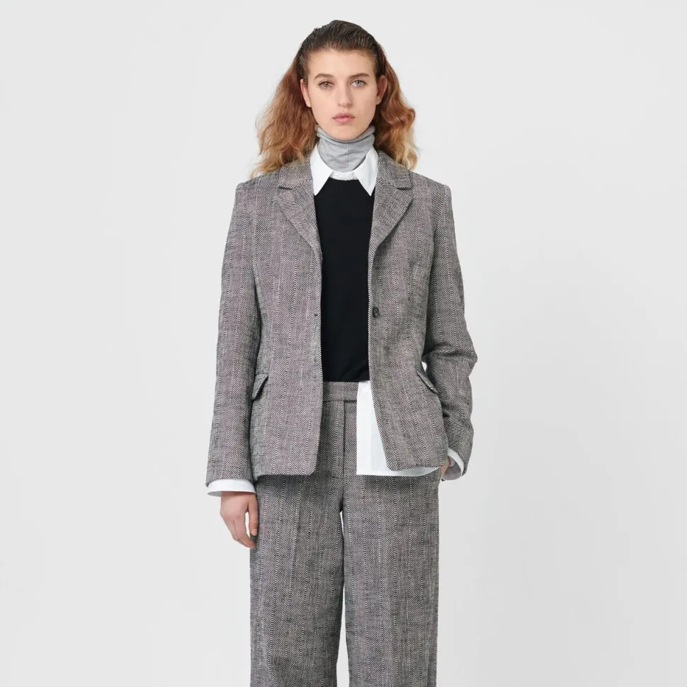 Sofistikeret blazer med en taljeret pasform, der smukt fremhæver figuren. Den enkle knaplukning og de praktiske lommer tilføjer både funktionalitet og et klassisk design, mens slidsen bagpå giver bevægelsesfrihed og et stilfuldt touch. Det elegante herringbone mønster skaber et raffineret udtryk, hvorfor blazeren er et must-have i garderoben.