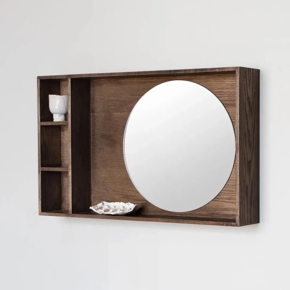 Et funktionelt statement-piece med en nostalgisk reference til 70’erne. Spejlhylden kombinerer et rundt spejl med en elegant hyldeløsning i mørkolieret egetræsfiner. De tre rum muliggør plads til nøgler, parfume eller små dekorationer – ideel til entréen, soveværelset eller teenageværelset. Spejlet kan monteres både horisontalt og vertikalt, og det skjulte ophæng sikrer et rent, minimalistisk udtryk.