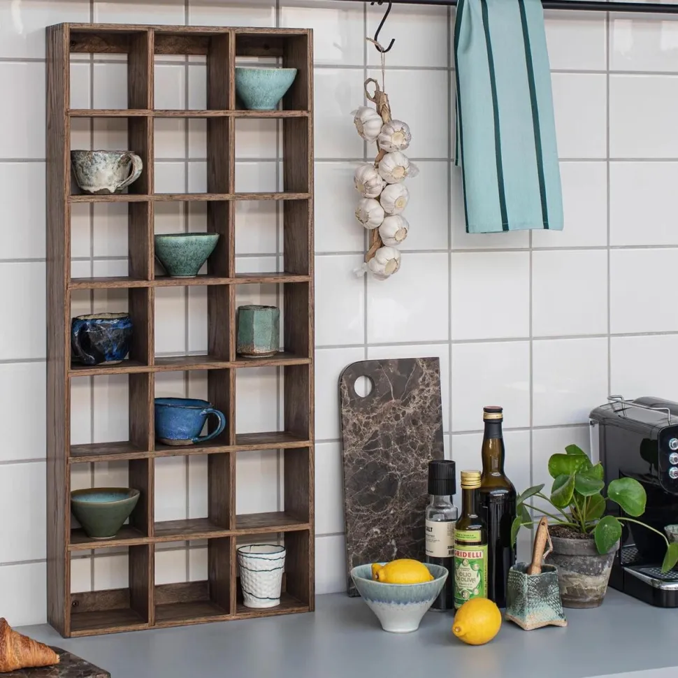 Klassisk sættekasse, der forener tidløst, skandinavisk design med funktionel elegance. Fremstillet i smukt mørkolieret egetræ med fingertappede samlinger, emmer den af varme, karakter og solidt håndværk. De 21 kvadratiske rum indbyder til at fremvise yndlingskrus eller kreative skatte. Det fleksible design gør det muligt at montere kassen både horisontalt og vertikalt, hvor det åbne layout lader væggens farve spille med og skaber et let, luftigt udtryk – smukt både fyldt og tomt.