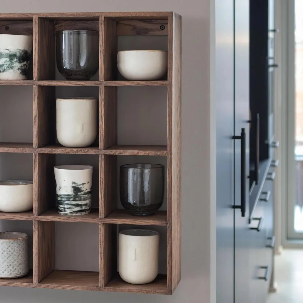 Tidløs sættekasse, der på fineste vis kombinerer elegance og funktionalitet. Fremstillet i smukt mørkolieret eg med fingertappede samlinger, forener den håndværk og æstetik i ét tidløst design. De 12 kvadratiske rum muliggør plads til opbevaring og fremvisning af alt fra yndlingskrus til små skatte. Det åbne design, tillader væggens farve at skinne igennem og skaber et let, harmonisk udtryk, der elegant smelter sammen med indretningen, uanset hvilket rum kassen placeres i. Hvert stykke egetræ bærer på sin egen karakter med naturlige variationer i farve, knuder og årer, hvilket gør hver kasse unik – et subtilt, men markant statement i hjemmet.