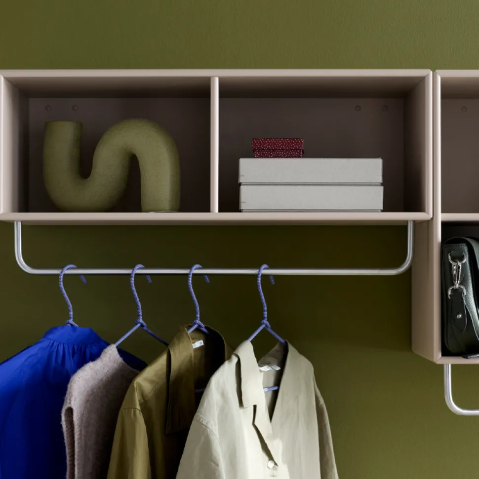 Coat er en del af Montanas Collection serie, der består af enkle nyfortolkninger af opbevaringsløsninger til den moderne boligindretning. Coat består af et hyldemodul med to rum, hvorunder der er monteret en bøjlestang.