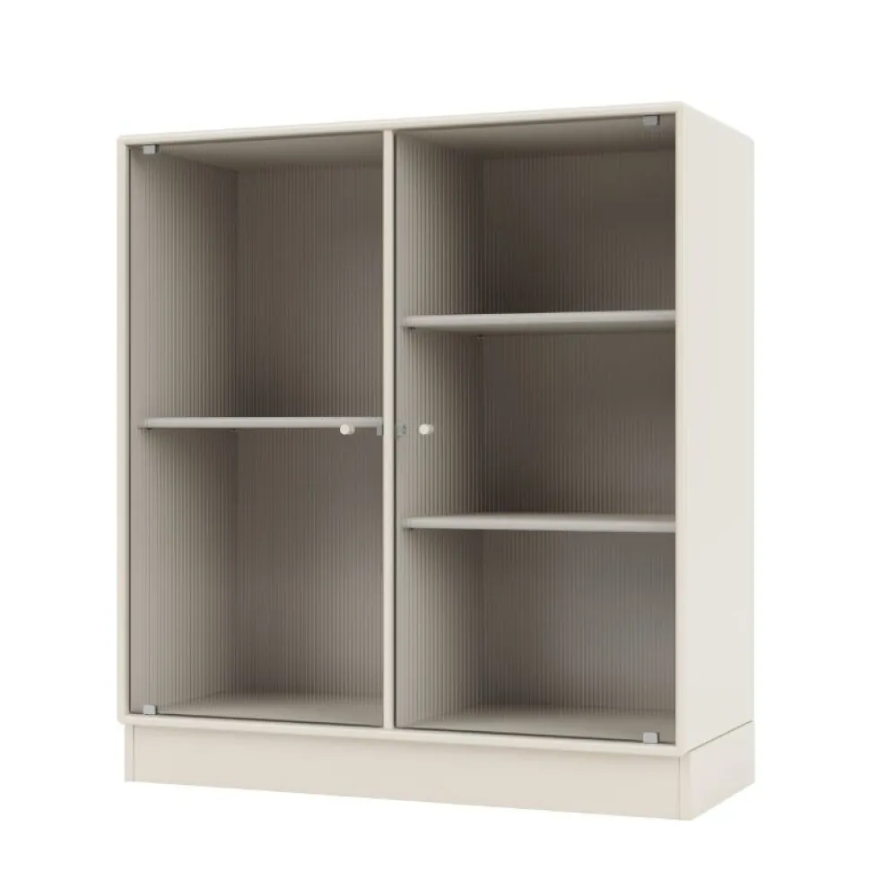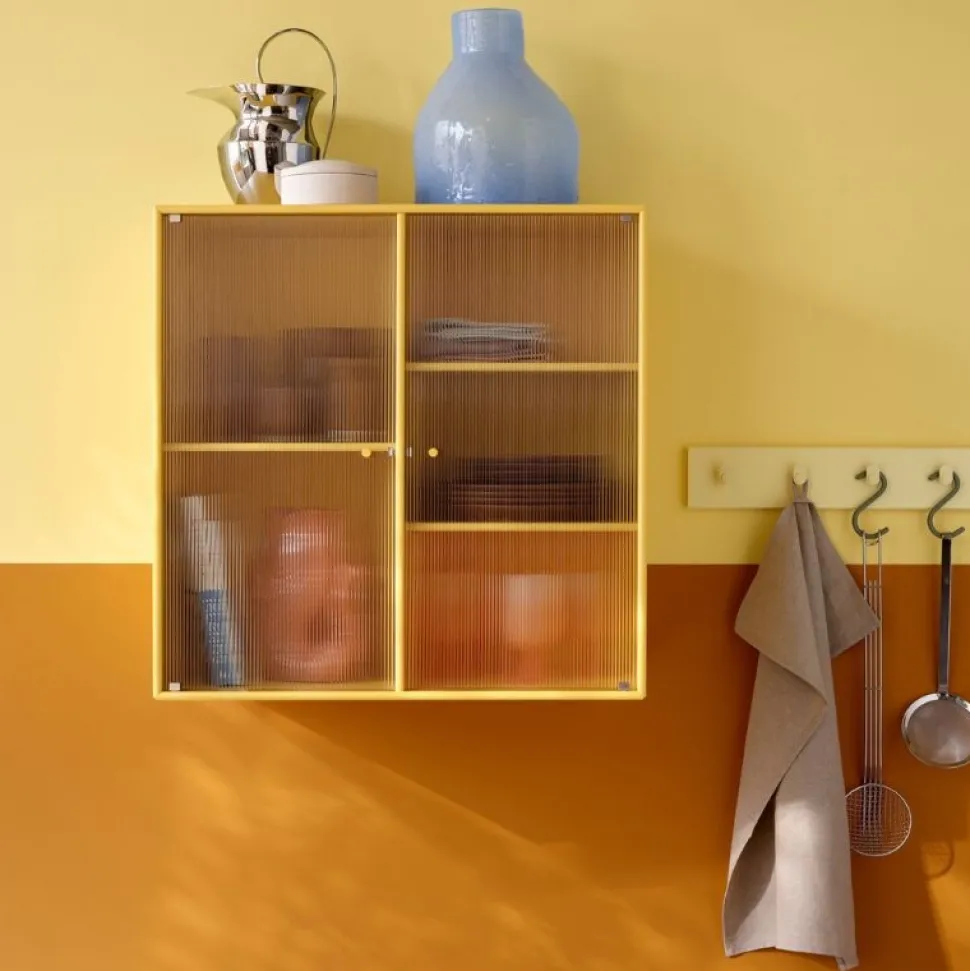 Det smukke Ripple 2 fra Montana er et vitrineskab med 2 låger i riflet glas. Skabet fås med ophængsbeslag, sokkel og ben. Skabet kan elegant indgå i ethvert køkken, eller som et udstillingsmøbel i stuen eller spisestuen.