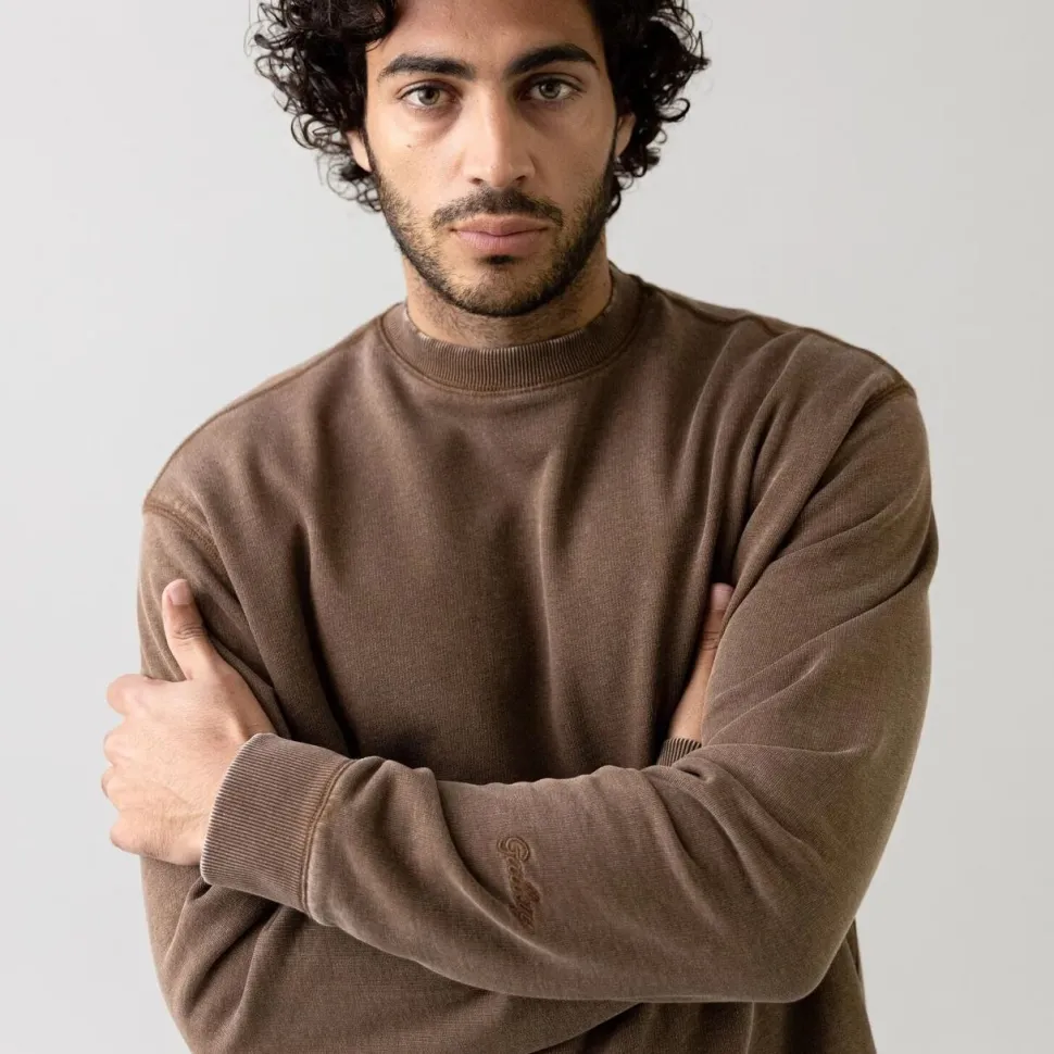 Tidløs sweatshirt, der repræsenterer et forfinet samspil mellem moderne afslappethed og klassisk æstetik. Den dybe, chokoladebrune tone kombineres med en subtilt falmet finish, hvilket skaber et farveudtryk, der både er nedtonet og sofistikeret. Med sin regulære pasform, let sænkede skuldre og tidløse O-hals udtrykker modellen en balanceret æstetik, hvor komfort og design går op i en højere enhed. Snittet fremstår hverken for stramt eller for løst, men hviler elegant i grænselandet mellem det afslappede og det velklædte, hvorfor stylingsmulighederne er alsidige.