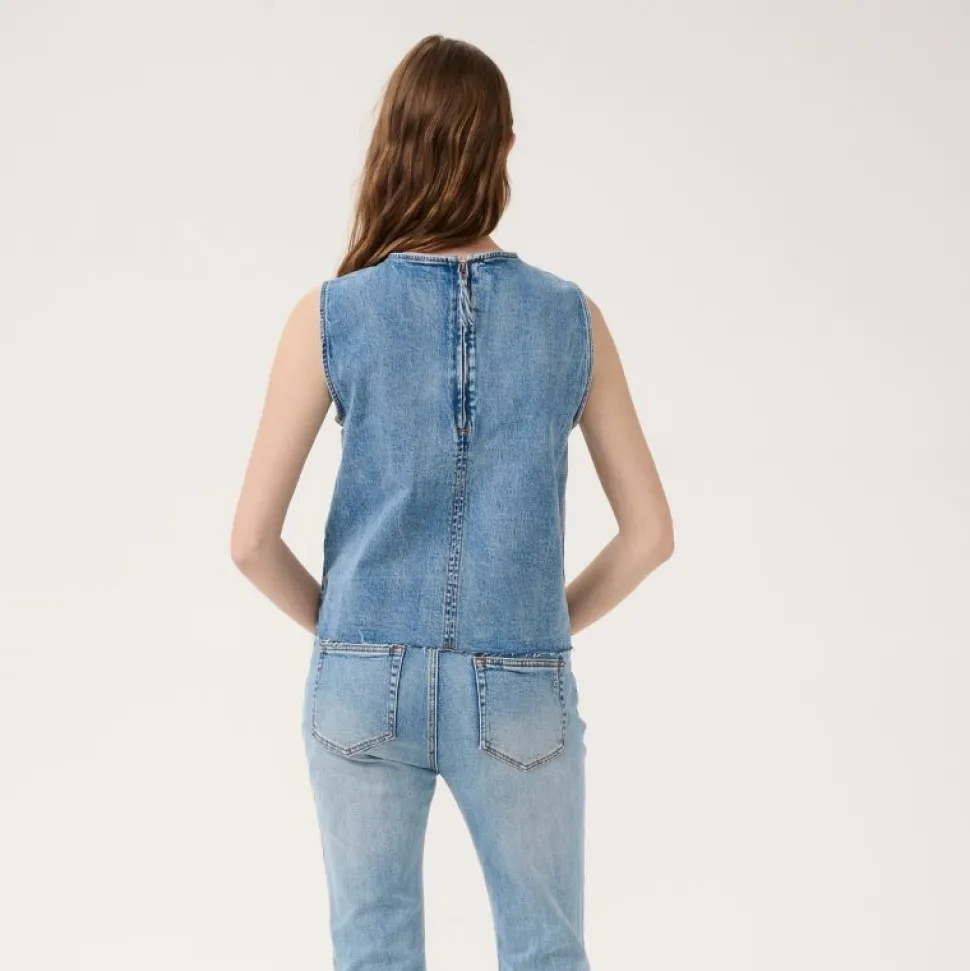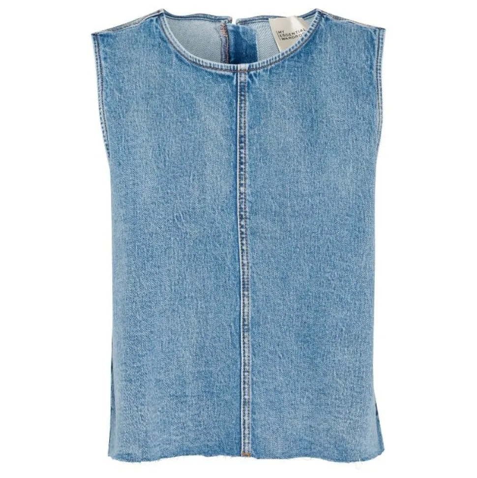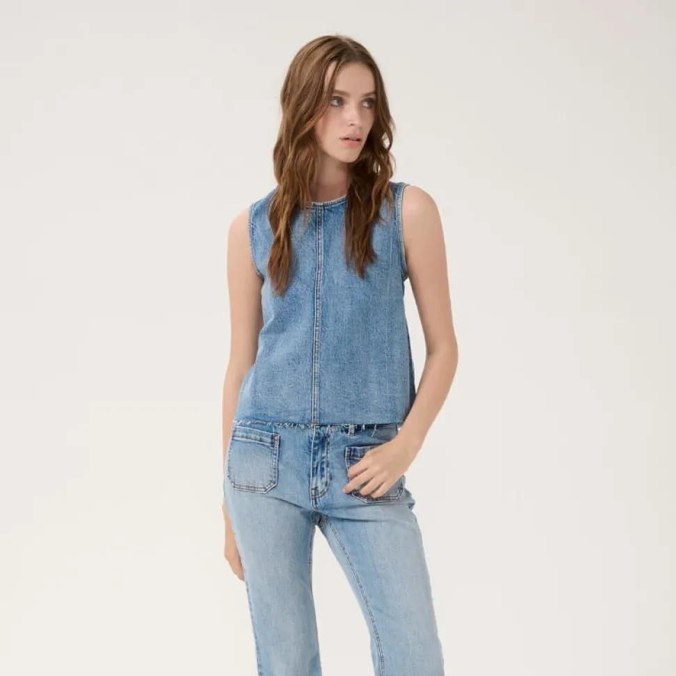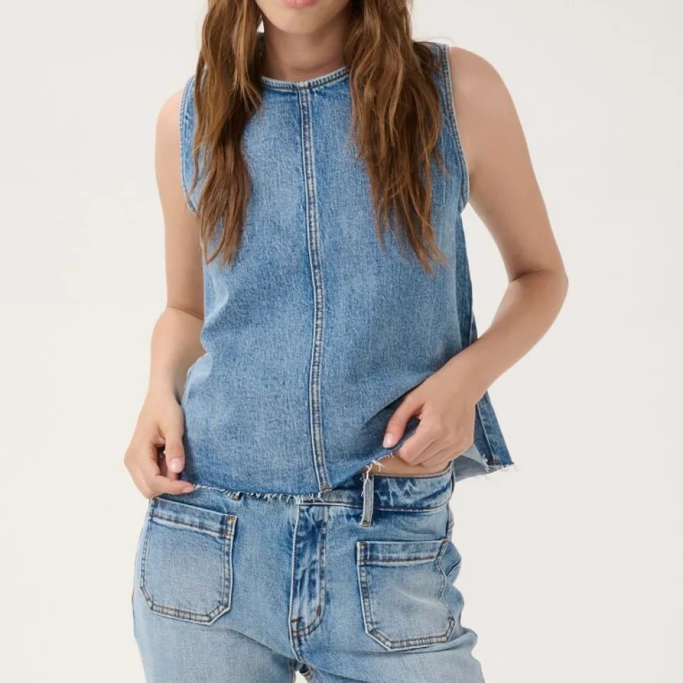 Denne ærmeløse top i Light Blue Retro Wash kombinerer et moderne boxy fit med en klassisk denimfinish. Den hoftekorte længde giver et afslappet, men veldefineret udtryk, som gør toppen nem at style både med højtaljede bukser, nederdele eller som lag-på-lag over en skjorte.