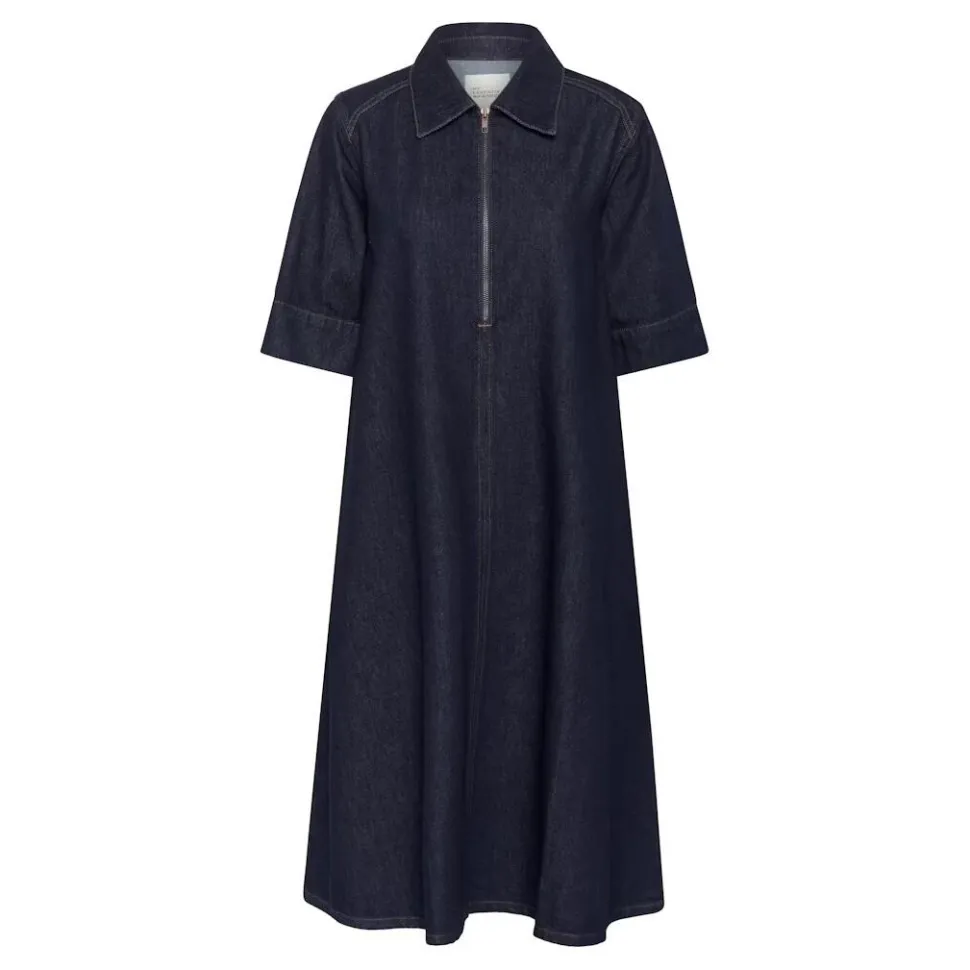 Klassisk denimkjole med tidløse detaljer. Kjolen er designet med en lige A-silhuet, halv-lange ærmer, midi-længde og en synlig lynlås foran, der tilfører et elegant og moderne udtryk. Den skarpe krave, markerede manchetter og den ensartede mørkeblå finish fuldender det sofistikerede look. Et alsidigt garderobeitem, der både fungerer som enkelt statement og i lag-på-lag styling.