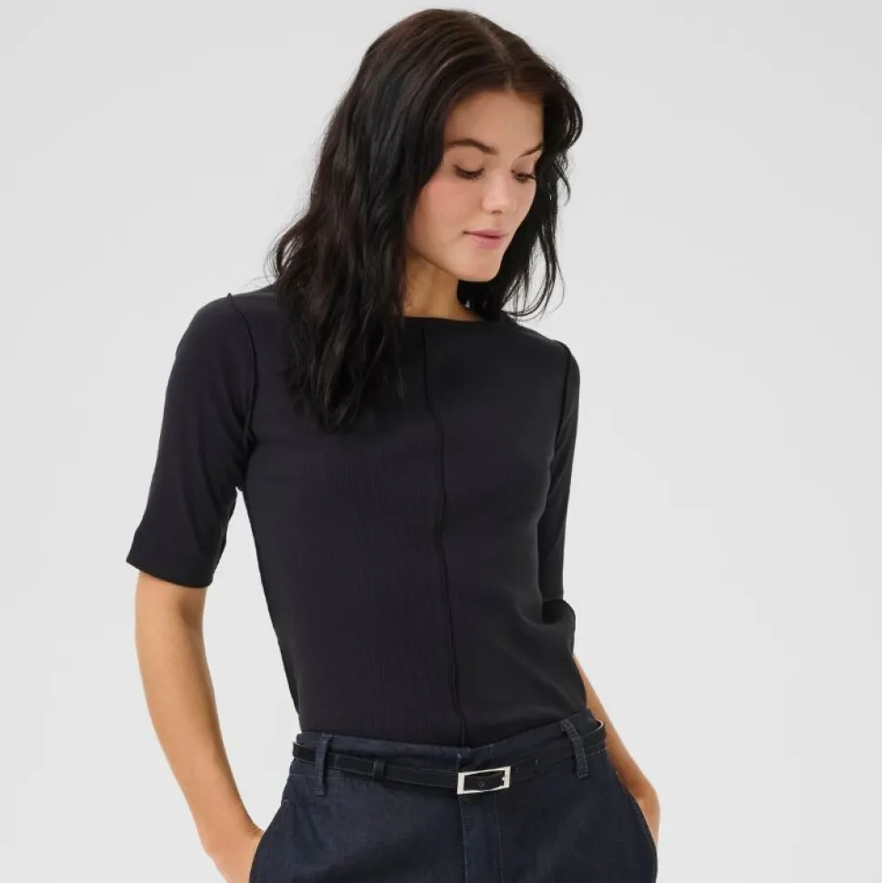 Denne t-shirt i sort er et stilrent og alsidigt basic-item med en casual pasform og kort ærme, der gør den ideel til både afslappet og stilren hverdagsbrug. Med sin hoftekorte længde og let strækbare bomuldsblanding får du en t-shirt, der både føles behagelig og holder formen hele dagen.