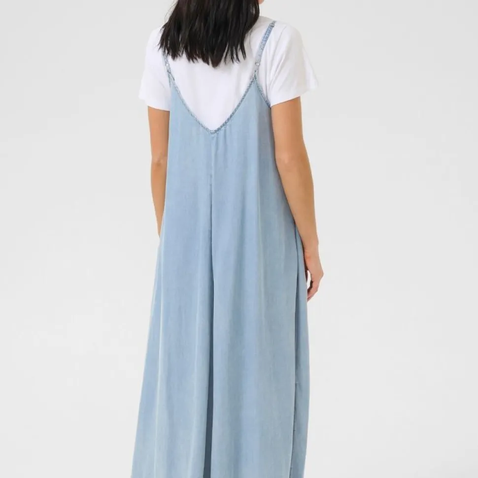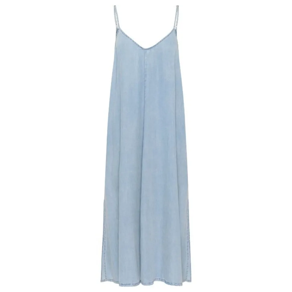 Fremstillet i 100% lyocell, er kjolen ikke bare smuk, men også behagelig mod huden og bæredygtig i sit materialevalg. Lyocell er kendt for sine åndbare egenskaber og silkebløde tekstur, hvilket gør denne kjole til et oplagt valg, når komfort og stil skal gå hånd i hånd. Den lyseblå vask giver et afslappet, moderne udtryk, som er let at style med både sandaler og sneakers.