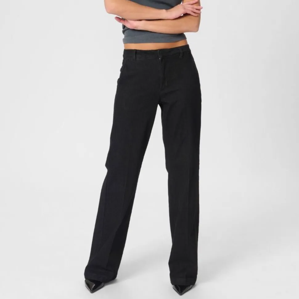 Disse jeans med vide ben kombinerer en afslappet pasform med et stilrent, struktureret udtryk. De har en mellemhøj talje og elegante paspolerede baglommer, der tilfører et skræddersyet præg. Den fulde benlængde giver et sofistikeret look, mens den løse pasform og det bløde bomuldsstretch sikrer komfort hele dagen. Perfekte til både hverdag og mere polerede outfits. Farven er en klassisk sort vask, som er nem at style med alt i garderoben.