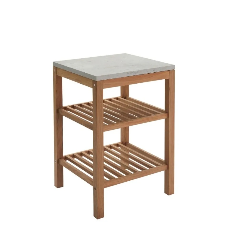 Pantry modul 1 har med to hylder og et stel i teak samt en topplade i kalksten god plads til opbevaring af køkkenredskaber, værktøj, krukker og meget mere.