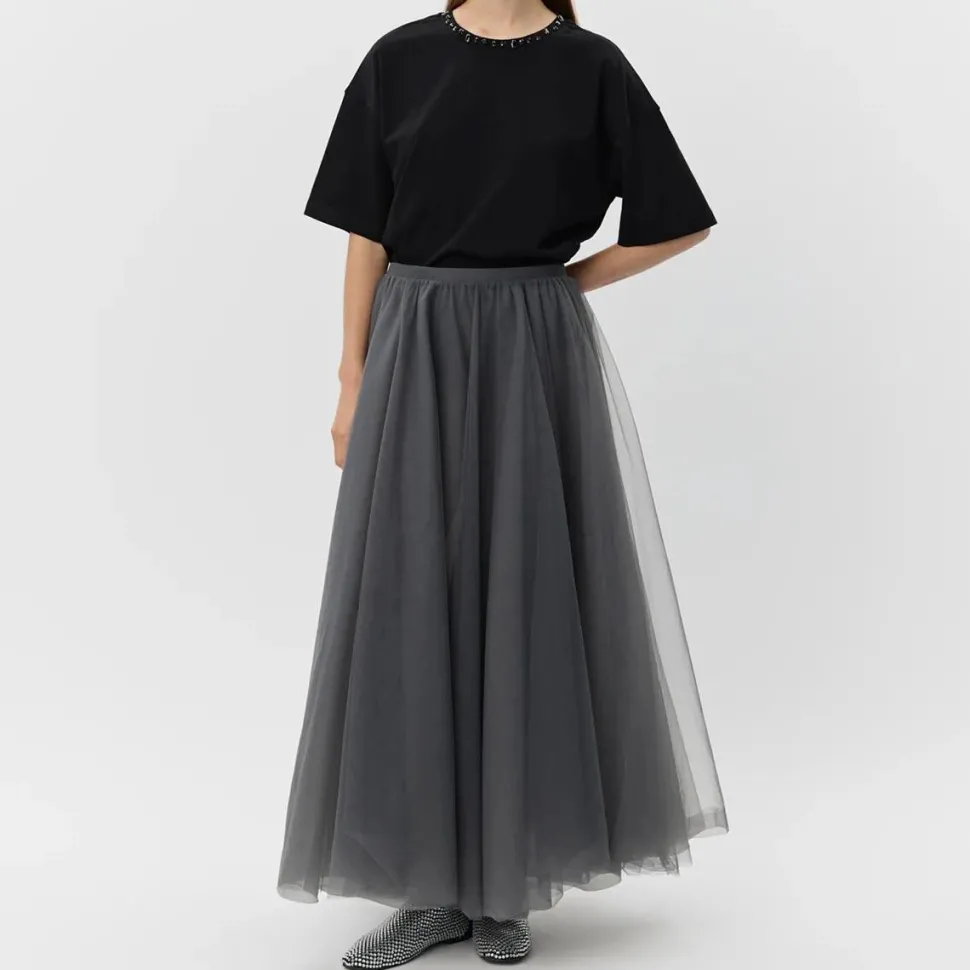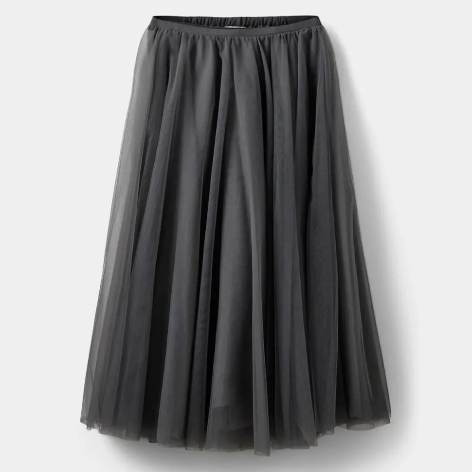 Iøjnefaldende maxi-nederdel, der emmer af feminin elegance. Nederdelen er designet med fire lag transparent tyl, der skaber et let, svævende fald og en romantisk silhuet. Den A-formede pasform med diskret vidde giver bevægelsesfrihed, mens den elastiske linning sikrer komfort hele dagen. Nederdelens lagdelte struktur fremhæver en sofistikeret balance mellem boheme-elegance og moderne enkelhed – ideel til både hverdag og særlige anledninger.