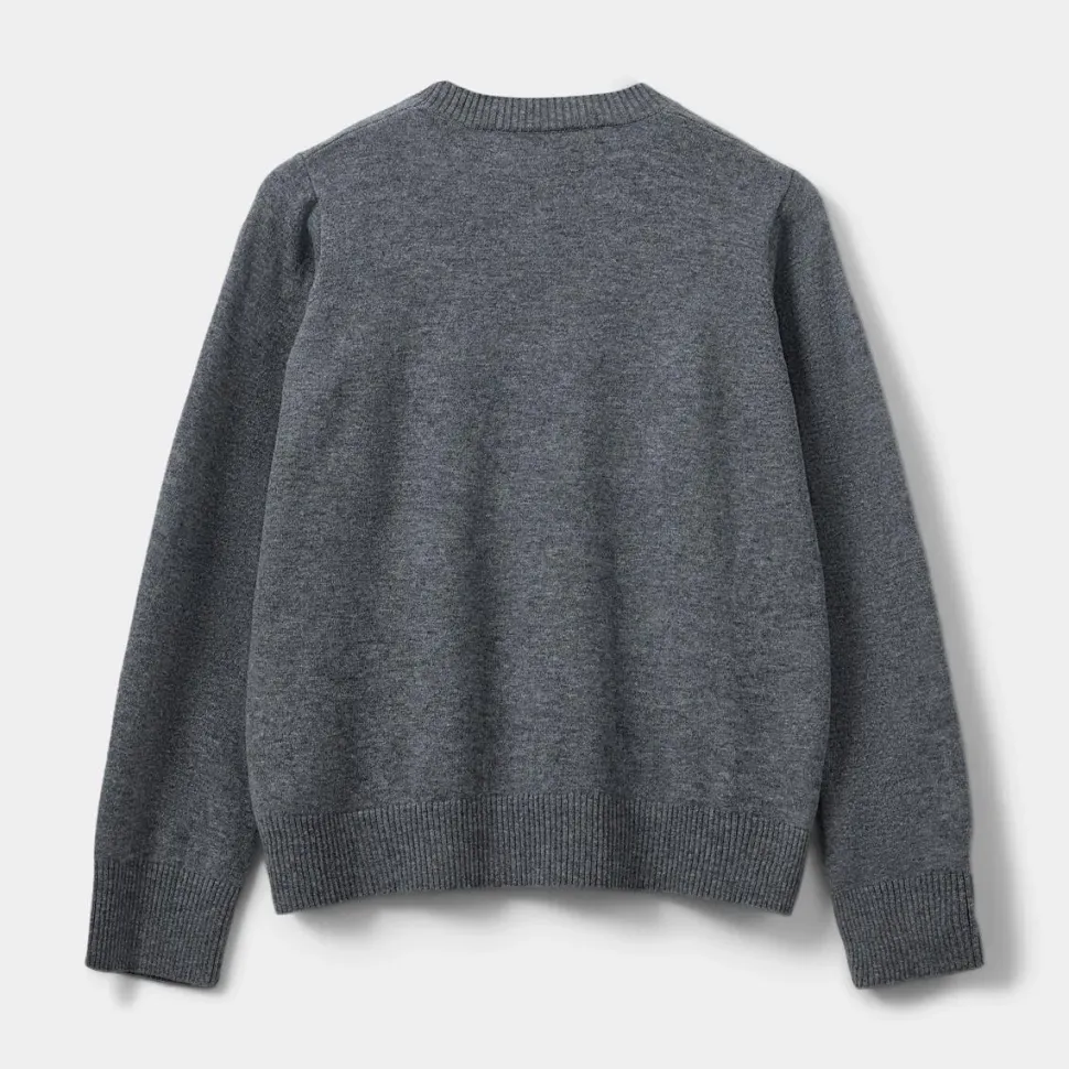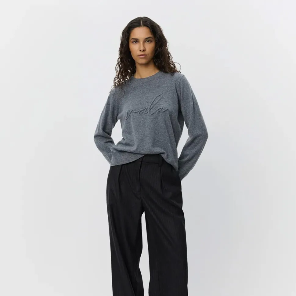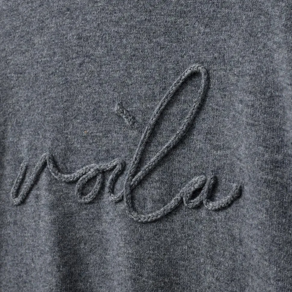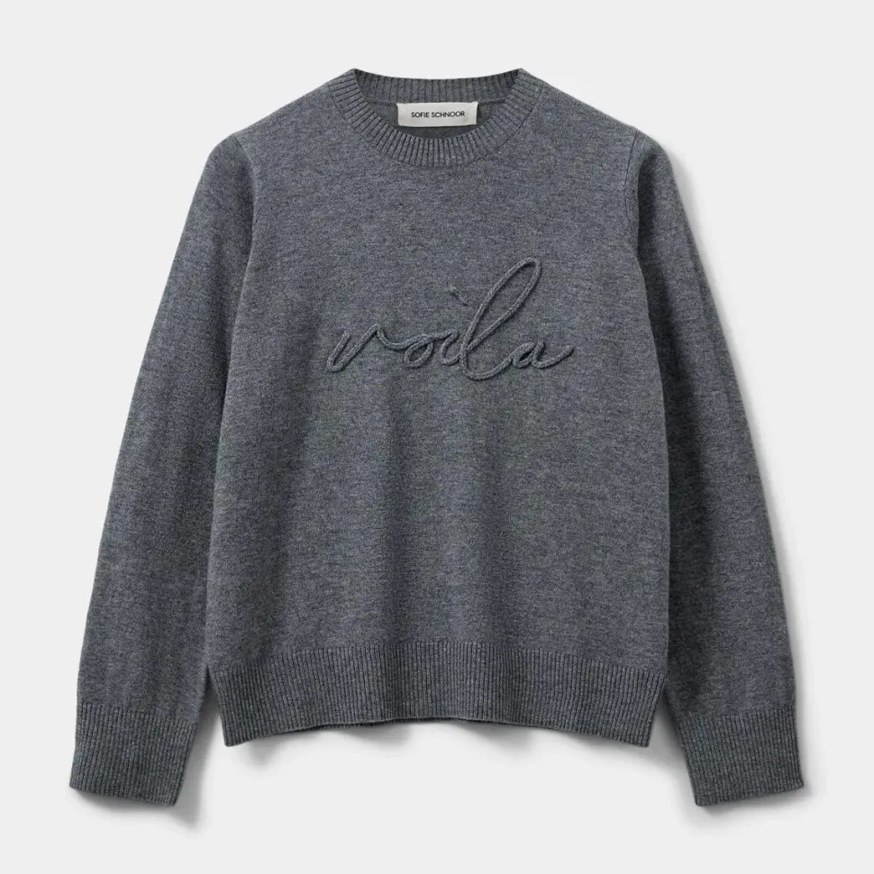 Minimalistisk, men med attitude – en gråmeleret klassiker med moderne finesse. Det enkle design kombineres med et afslappet, men velklædt fit, der giver et tidløst udtryk. Den runde hals og de ribstrikkede kanter fremhæver sweaterens rene linjer, mens det subtile broderi med teksten “Voila” tilfører et sofistikeret, fransk-inspireret touch. Resultatet er en sweater, der balancerer ubesværet elegance med en legende detalje. En alsidig favorit, der nemt kan blive en fast del af garderoben.
