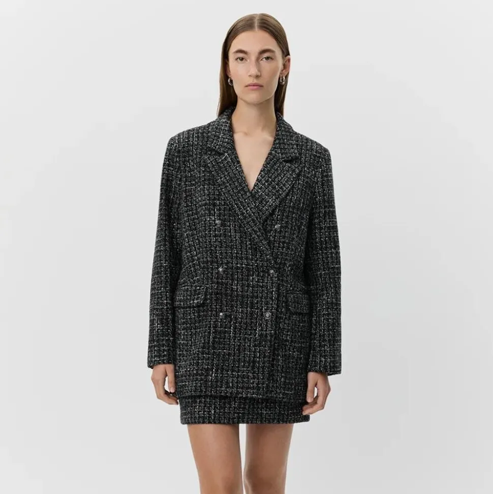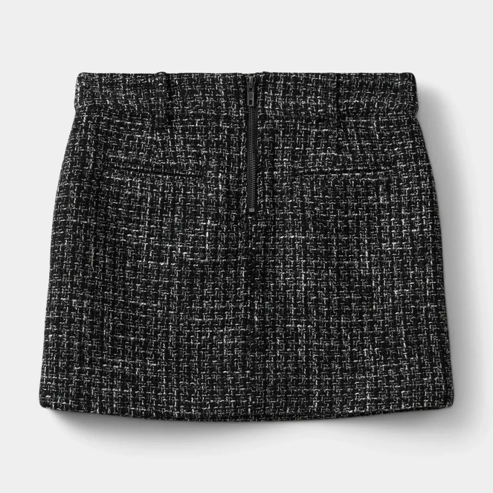 Bouclé mini-nederdel, der forener klassisk tekstur med et moderne, feminint snit. Nederdelen er designet med en fast linning med bæltestropper, der giver mulighed for styling med bælte, samt to praktiske forlommer, som tilføjer et afslappet, men elegant udtryk. Bagpå lukkes den med en diskret lynlås, der sikrer en glat og flatterende silhuet.