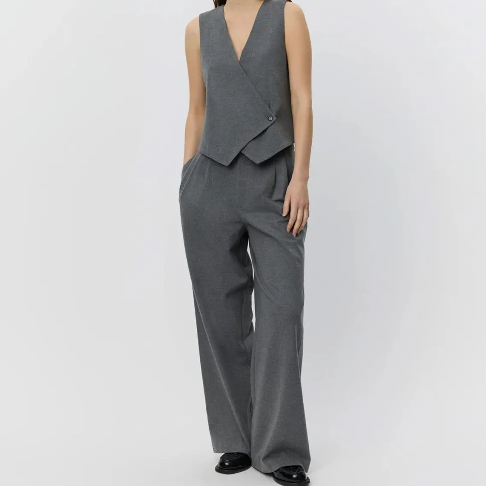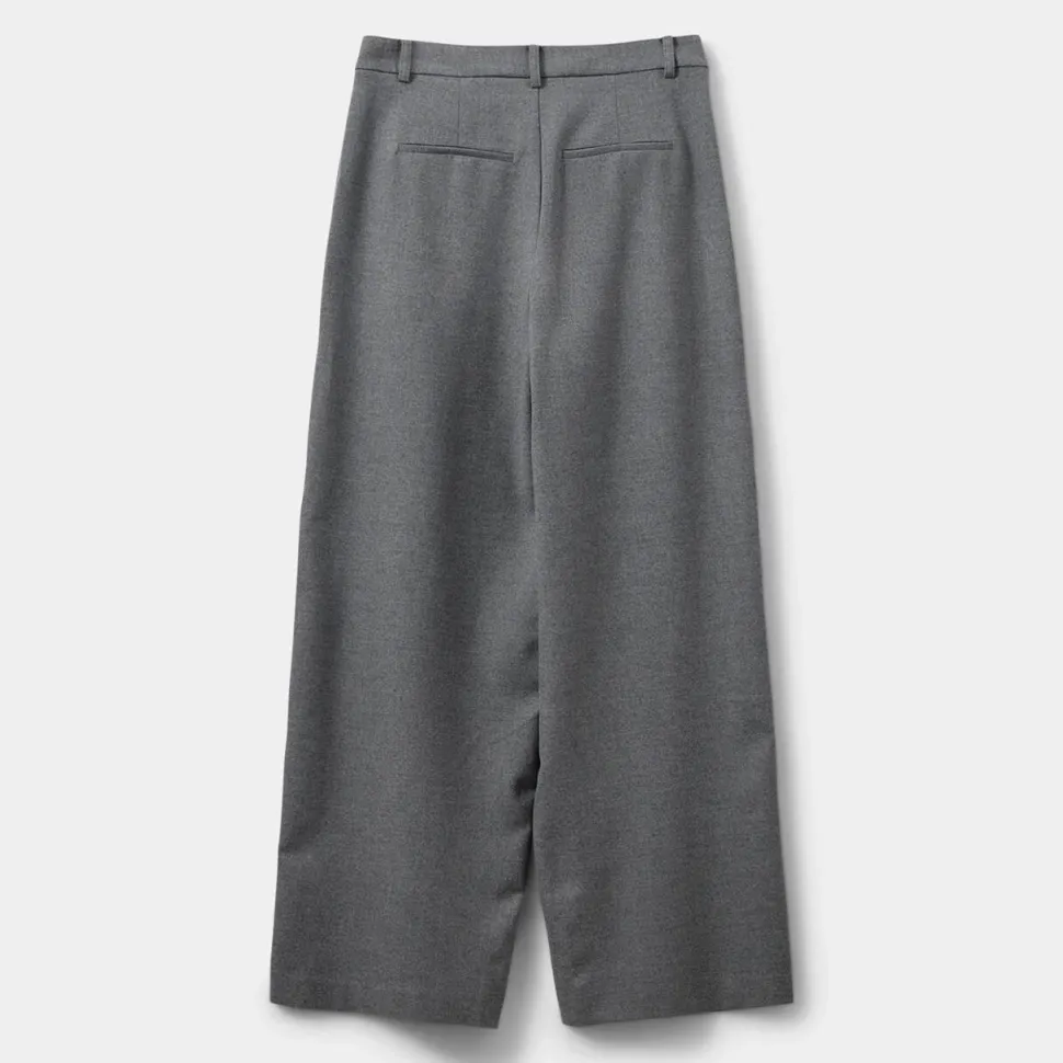 Elegante og alsidige bukser i et moderne design. Bukserne er designet med høj talje og vide ben, hvilket både giver komfort og fremhæver silhuetten på smukkeste vis. De fine læg foran tilfører struktur, mens lynlås- og knaplukning, bæltestropper og sidelommer sikrer praktisk funktion uden at gå på kompromis med designet. Bagpå findes paspolerede snydelommer, som giver et poleret og detaljeret finish.