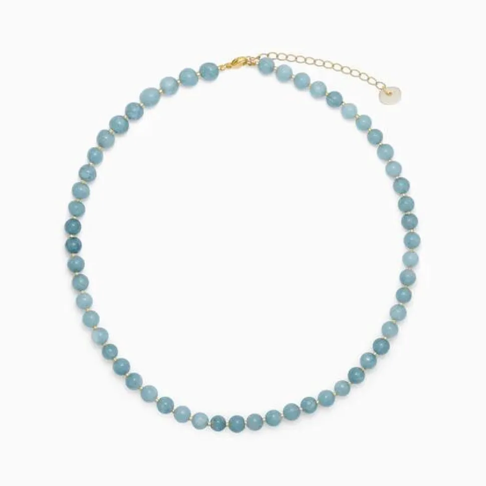Enkel og tidløs halskæde i havets farvenuancer, der symboliserer mod, positivitet og glæde. De blå toner repræsenterer klarhed og indre ro, hvorfor halskæden er skabt med formålet om at finde mere mod, være beskyttende og finde harmoni. Aquamarinen menes at have beroligende egenskaber, der kan lindre stress og angst. Håndlavet med omhu og finesse er halskæden mere end blot et smykke – dén er et symbol på balance og positivitet. Halskæden er unika, idet krystaller aldrig er ens.