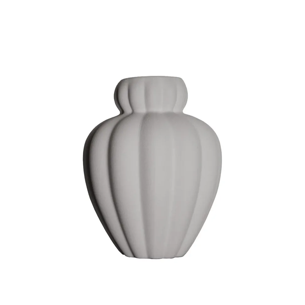 Enkel vase i et moderne formsprog. Udtrykket er skulpturelt, hvorfor vasen er designet til at være et centralt designobjekt i boligindretningen. Vasens bølgende linjer, strukturelle sandinspireret overflade og naturlige farvenuance tilfører et unikt touch til indretningen. Hver enkelt vase er håndlavet, hvorfor der kan forekomme variationer og andre ufuldkommenheder.