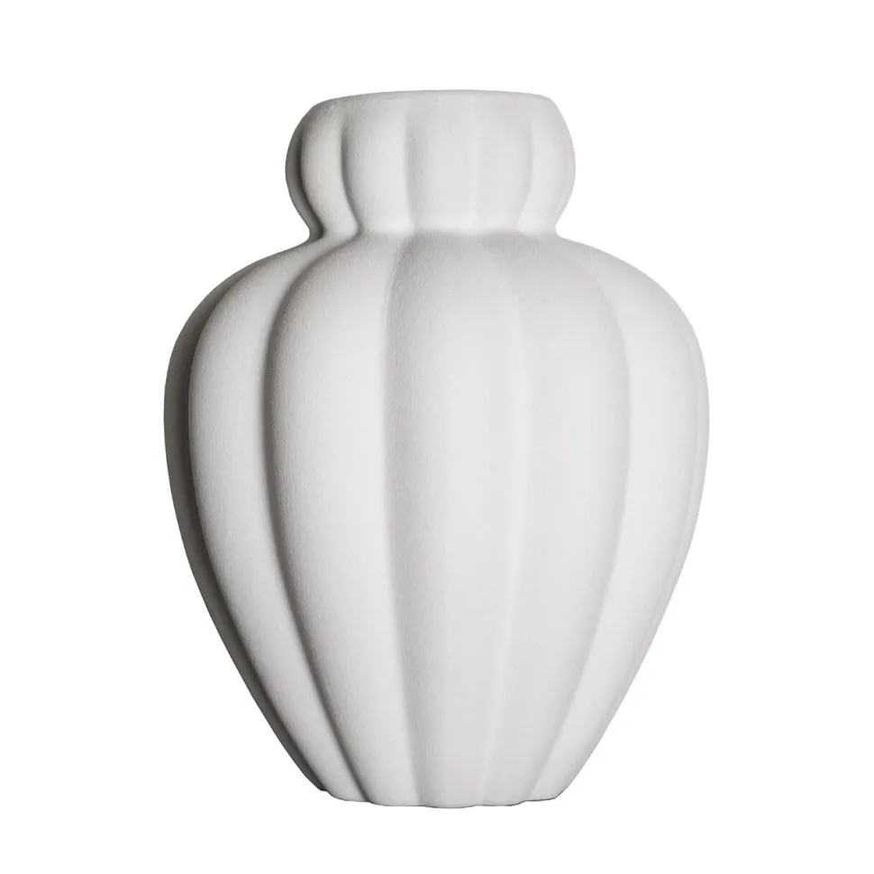 Enkel og enestående vase, der med sit skulpturelle og moderne formsprog er designet til at være et centralt designobjekt i boligen. Vasens bølgende linjer, strukturelle sandinspireret overflade og tidløse farvenuance tilfører et unikt touch til indretningen. Hver enkelt vase er håndlavet, hvorfor der kan forekomme variationer og andre ufuldkommenheder.