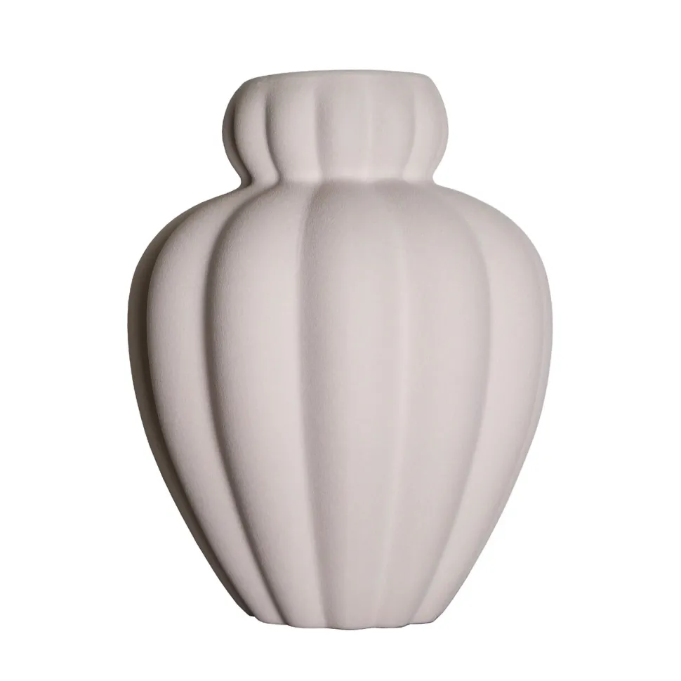 Yndig og stilfuld vase, der med sit skulpturelle og moderne formsprog er designet til at være et centralt designobjekt i boligen. Vasens bølgende linjer, strukturelle sandinspireret overflade og naturlige farvenuance tilfører et unikt touch til indretningen. Hver enkelt vase er håndlavet, hvorfor der kan forekomme variationer og andre ufuldkommenheder.