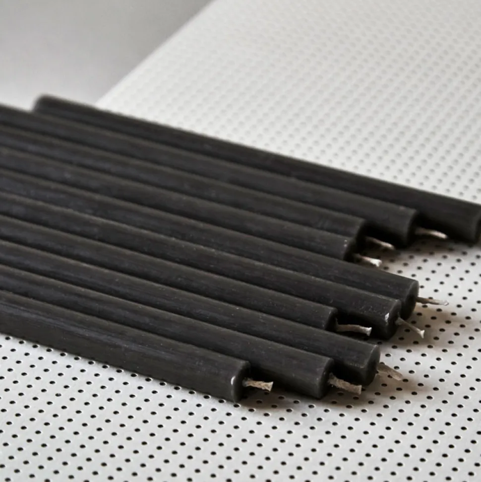 Helt enkle, originale kertelys til den fine STOFF modullysestage af Hans Nagel. Lysene er sorte, og de kommer i en pakke med 12 stk. Lavet i paraffin voks.