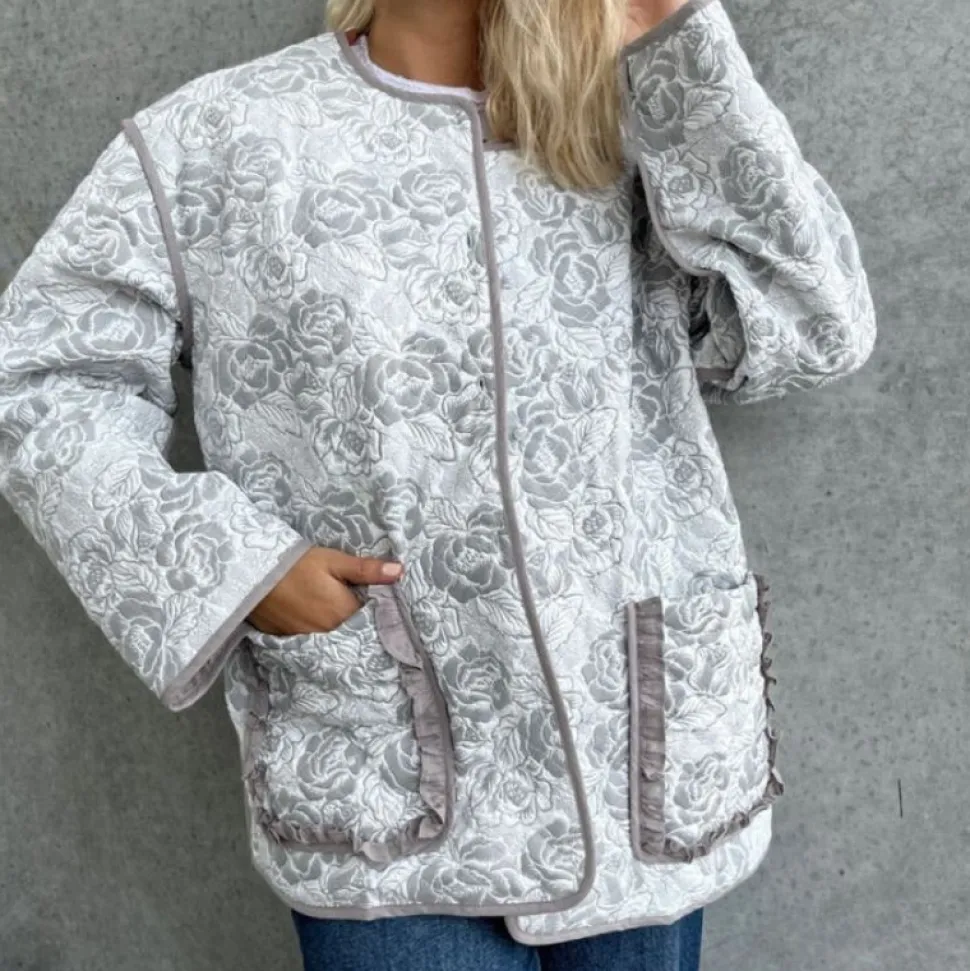 Denne quiltede jakke med smukt blomsterdesign forener feminin elegance med praktiske detaljer. Det strukturerede materiale med vævede rosemønstre giver et eksklusivt udtryk, mens kontrastkanter og pyntelommer med flæsekant tilfører et unikt og stilfuldt twist.
