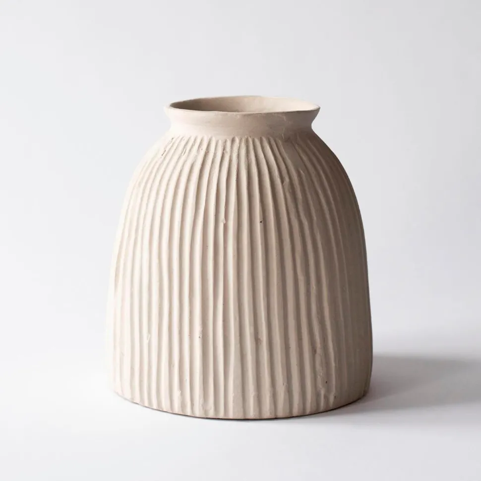 Yndefuld potte, der tilføjer et smukt, tidløst og bæredygtigt udtryk til hjemmet. Potten er skabt af genbrugte aviser og håndlavet i en indisk landsby, hvorfor hver potte har sin egen historie og udtryk. Potten er formet gennem et sirligt ribbet mønster, der tilfører karakter og varme til boligindretningen. Den rustikke charme bevirker, at dén er en skulpturel detalje – uanset om den placeres alene eller kombineres med andet interiør.
