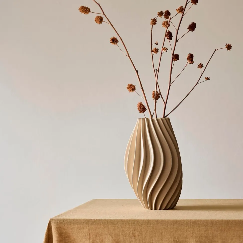 Vasen kan stå som et markant solostykke eller indgå i en harmonisk sammensætning med andre dekorative objekter. En raffineret forening af innovation og poesi – skabt til at berige hjemmet med karakter, ro og et strejf af fremtidens håndværk.
