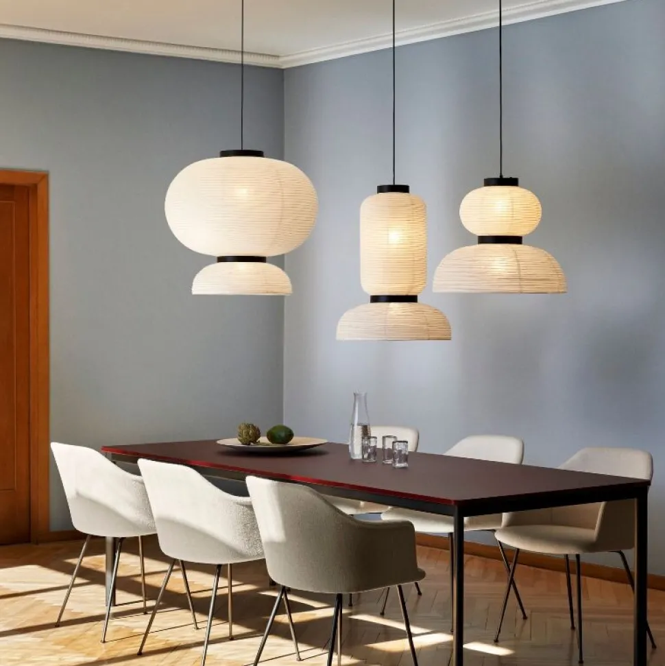 Håndlavet med rispapir, der blander forskellige størrelser og former sammen. Serien består af tre forskellige lanterneversioner og en bordlampe i elfenben-hvidt papir med sortbejdset egedetaljer.