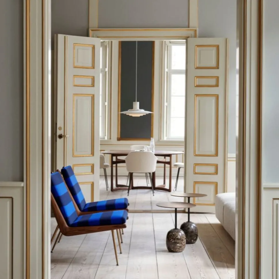 Oprindeligt udtænkt i 1963, fem koncentriske nuancer skaber gradueringer af kurver mod midten af lampen for at udsende et blødt, diffust lys. Den diskrete placering af nuancerne og den silkebløde aluminiumsfinish kulminerer i et sammenhængende udtryk, der er både ikonisk og medrivende.